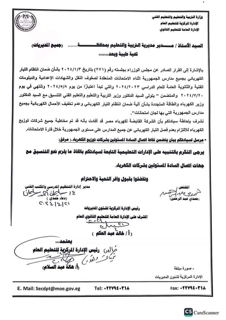 وتضمن " يتولى الدكتور وزير التربية والتعليم والتعليم الفني التنسيق مع الدكتور وزير الكهرباء والطاقة المتجددة بشأن آلية ضمان انتظام التيار الكهربائي وعدم تخفيف الأحمال الكهربائية بجميع مدارس الجمهورية التي بها لجان امتحانات".