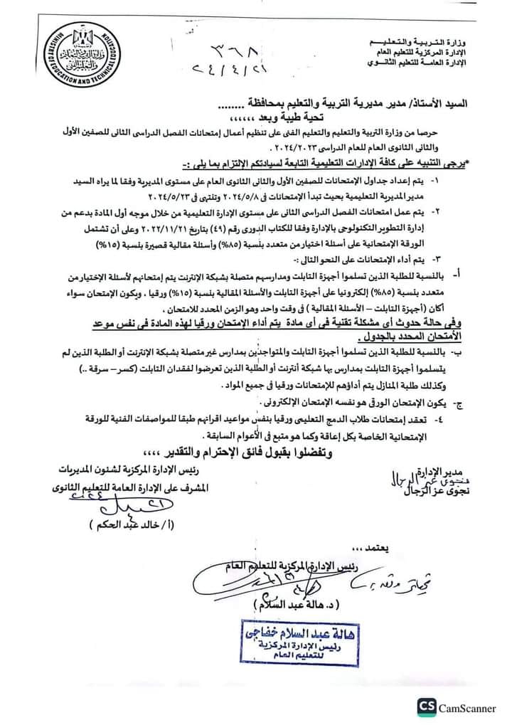 أوضحت وزارة التربية والتعليم والتعليم الفني، أنه حرصا على تنظيم أعمال امتحانات الفصل الدراسي الثاني للصفين الأول والثاني الثانوى العام للعام الدراسي ٢٠٢٤/٢٠٢٣، يتم التنبيه على كافة الإدارات التعليمية بالإلتزام بما يلي:-