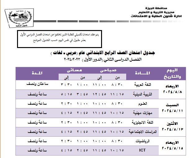 - جدول امتحانات الفصل الدراسي الثاني لتلاميذ الصف الرابع الابتدائي محافظة الجيزة