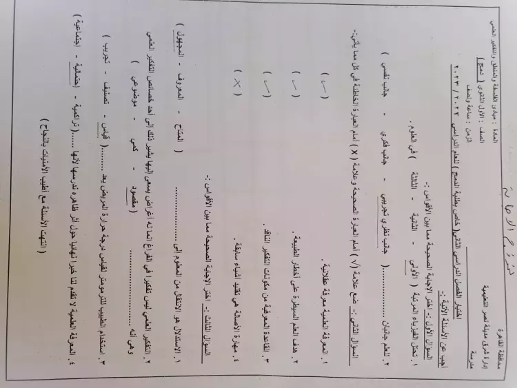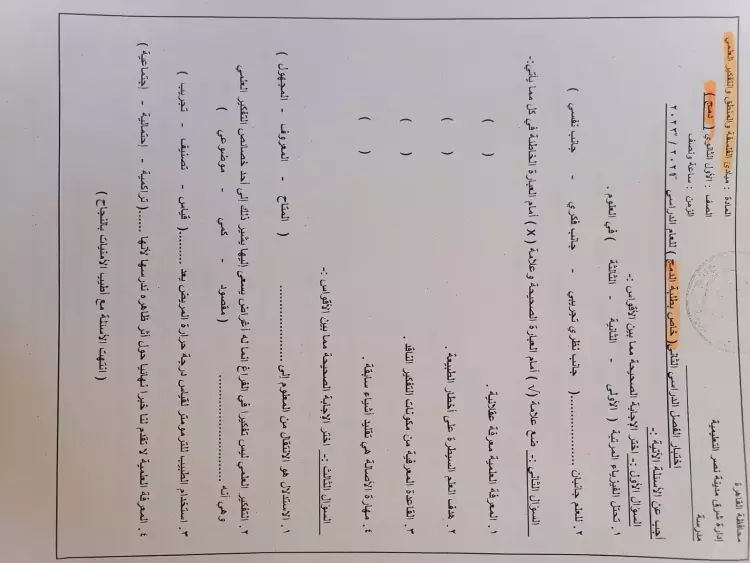 تستوفي الورقة الامتحانية البيانات الأساسية (المرحلة - الصف - المادة - الزمن - الدرجة - الفصل الدراسي).