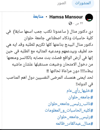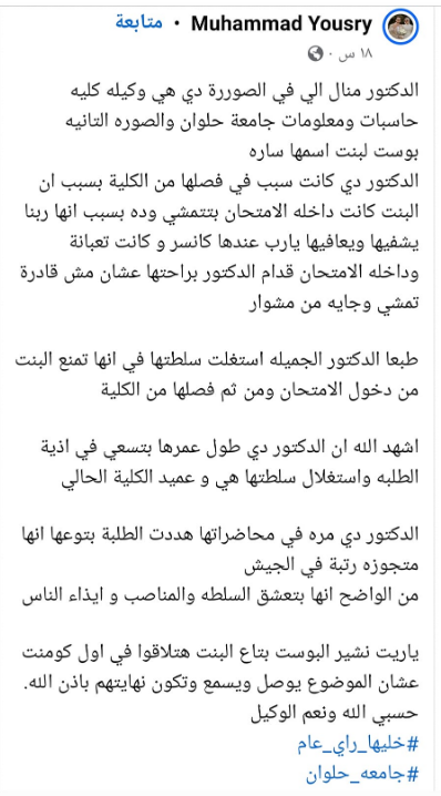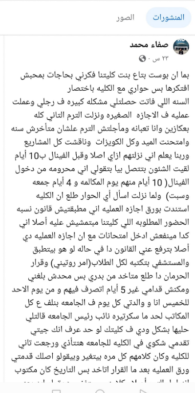 وجاء من ضمن منشور الطالبة سارة هشام:" خلال امتحانات الترم الأول منعتها وكيلة الكلية من دخول الكلية، بسبب أنها كانت تمشي ببطء أمام لجنة الكلية.. وخلال دخولها مادة أخلاقيات المهنة في الترم الأول منعتها الوكيلة من دخول الامتحانات وأصرت على ذلك، رغم رفض الطالبة سارة هشام هذا القرار، عندما منعتني وكيلة الكلية من الامتحان وطلبت لي الأمن، قررت عدم الدخول حتى لا تكون هناك أزمة وأتعرض للتعب بسبب مرضي، وتوجهت إلى مكتب الوكيلة لكي أعلم سبب منعي.. الوكيلة قالت لي إنها منعتني لأني كنت بمشي ببطء، وعندما أبلغت العميد أنني مريضة سرطان قالت لي إنها ممكن تقدم طلب لحفظ المادة بأعمال السنة، حتى لا يكون هناك رسوب".