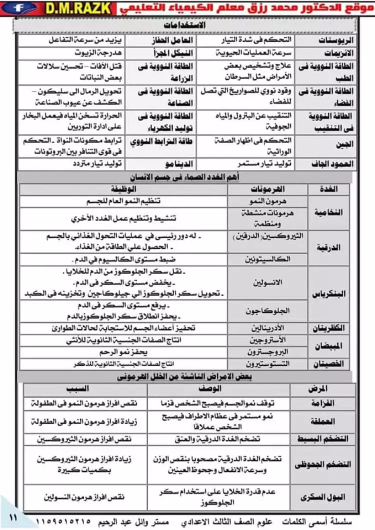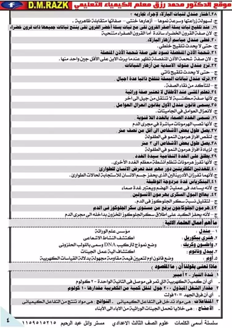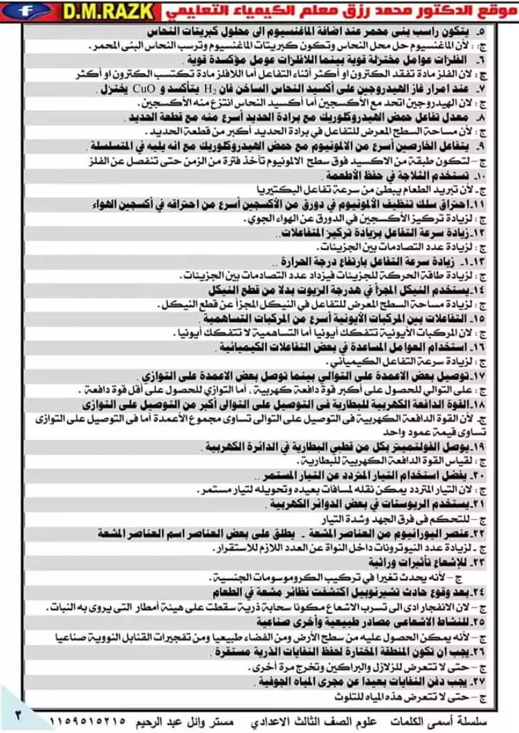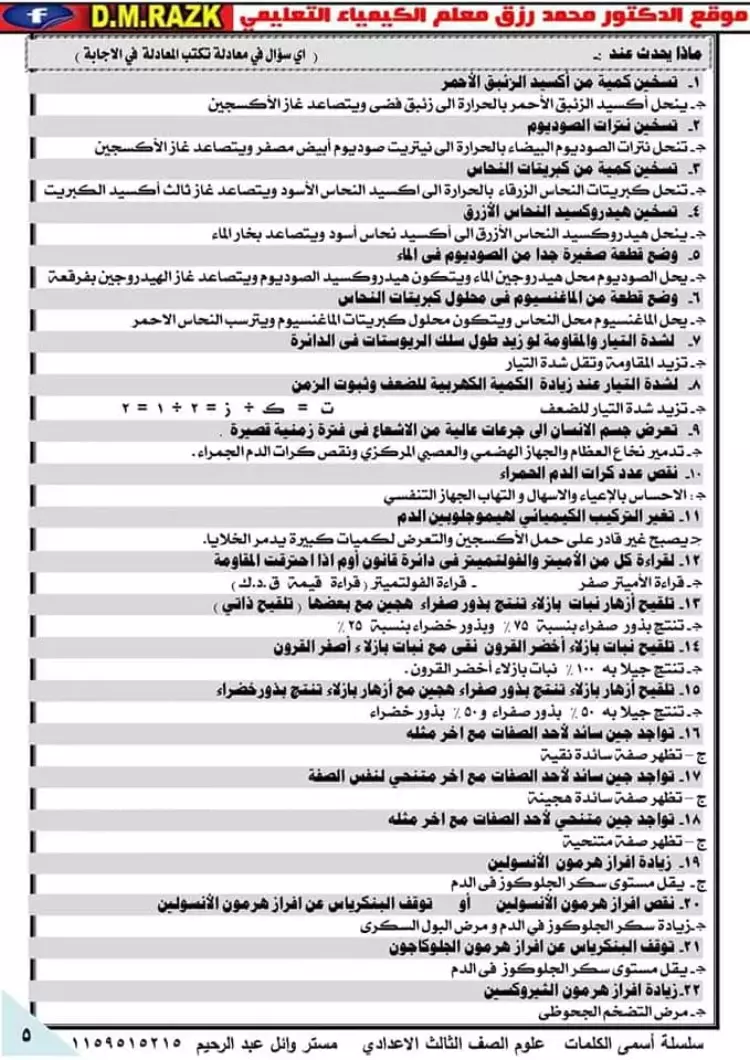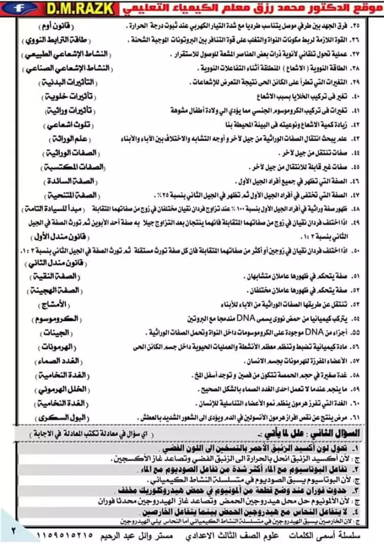 وجاء في ملزمة مراجعة علوم للصف الثالث الإعدادي الترم الثاني، والتي نستعرضها لكم في نهاية هذ التقرير ما يلي: