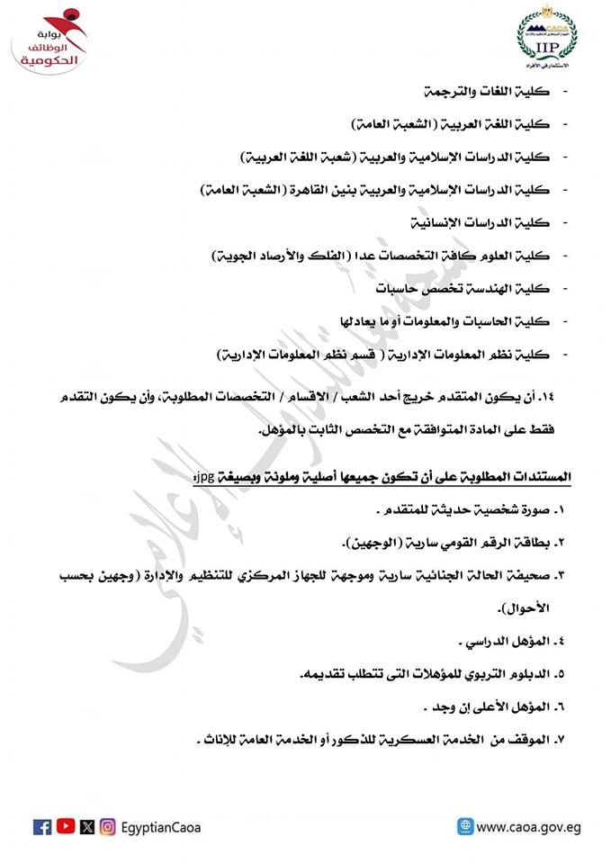 14. أن يكون المتقدم خريج أحد الشعب / الاقسام / التخصصات المطلوبة، وأن يكون التقدم فقط على المادة المتوافقة مع التخصص الثابت بالمؤهل.