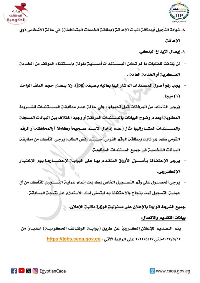 وفيما يتعلق بالمستندات المطلوبة يمكن للراغب في التقدم الإطلاع على تفاصيل الإعلان على موقع بوابة الوظائف الحكومية.