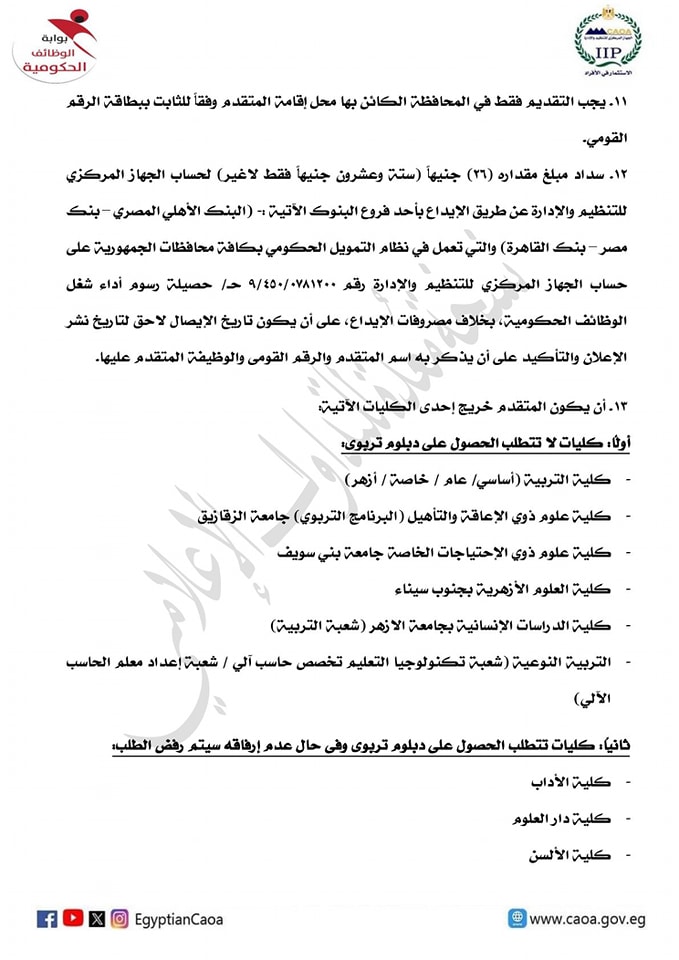 12. سداد مبلغ مقداره (26) جنيهًا (ستة وعشرون جنيهًا فقط لاغير) لحساب الجهاز المركزي للتنظيم والإدارة عن طريق الإيداع بأحد فروع البنوك الآتية:- (البنك الأهلي المصري – بنك مصر – بنك القاهرة) والتي تعمل في نظام التمويل الحكومي بكافة محافظات الجمهورية على حساب الجهاز المركزي للتنظيم والإدارة رقم 0781200/450/9 حـ/ حصيلة رسوم أداء شغل الوظائف الحكومية، بخلاف مصروفات الإيداع، على أن يكون تاريخ الإيصال لاحق لتاريخ نشر الإعلان والتأكيد على أن يذكر به اسم المتقدم والرقم القومى والوظيفة المتقدم عليها.