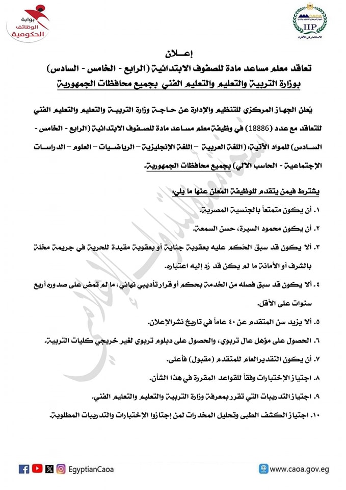 وأشار إلى أن المواد المطلوبة تتضمن الآتي: (اللغة العربية – اللغة الإنجليزية – الرياضيات – العلوم – الدراسات الاجتماعية - الحاسب الألي) وذلك بجميع محافظات الجمهورية، ومن المقرر أن يفتح الجهاز باب التقديم في المسابقة في الفترة من 14 إلى 27 مايو المقبل، على موقع بوابة الوظائف الحكومية https://jobs.caoa.gov.eg.
