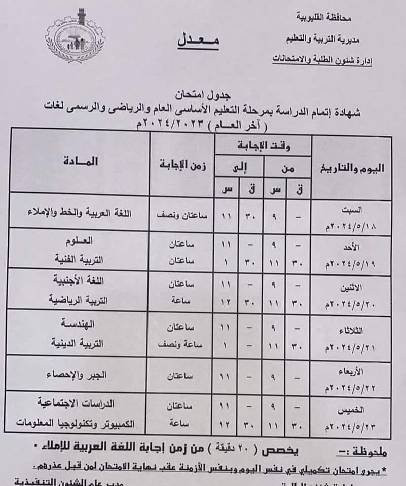 التعديلات الجديدة على جدول امتحانات الشهادة الإعدادية محافظة القليوبية