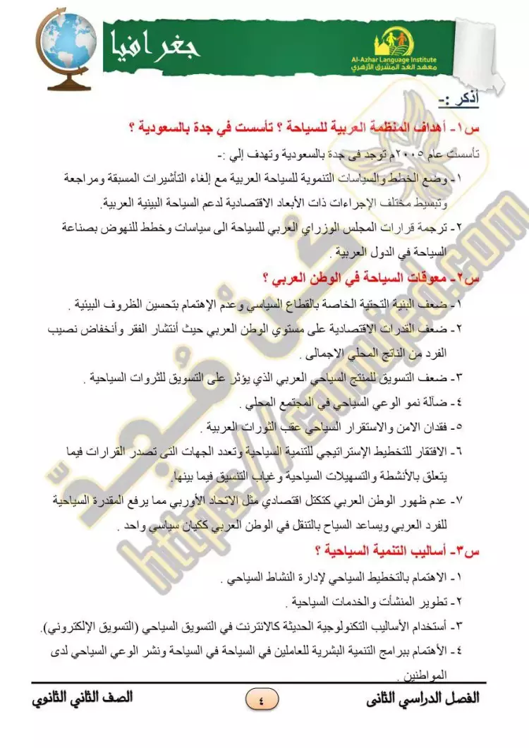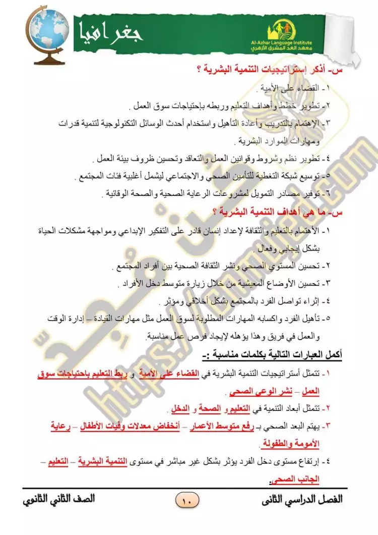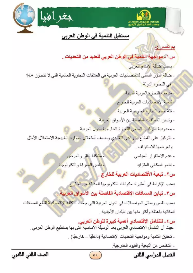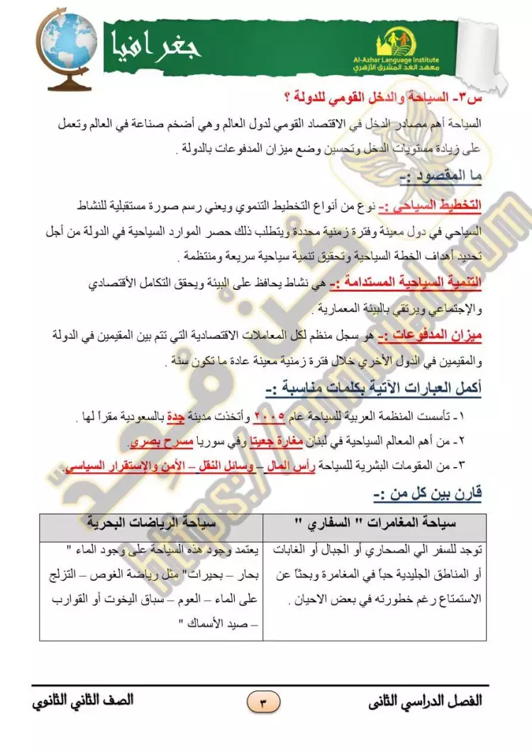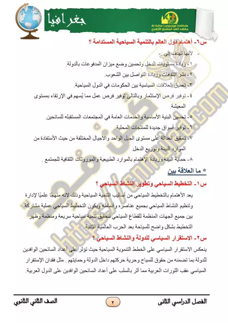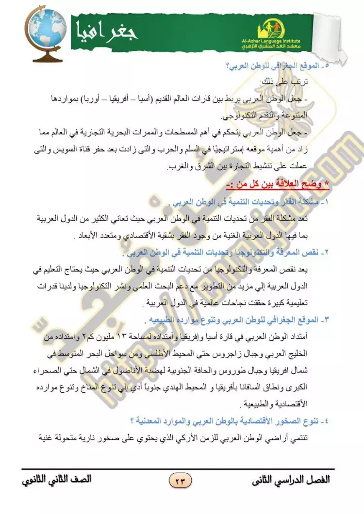 وقد احتوت مراجعة جغرافيا تانية ثانوي الترم الثاني، على المنهج كاملا في صورة أسئلة عديدة مجاب عليها، كما يلي: