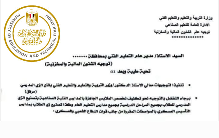 أرسلت وزارة التربية والتعليم والتعليم الفنى خطابًا إلى المديريات التعليمية بجميع المحافظات، بشأن الزي المدرسي.