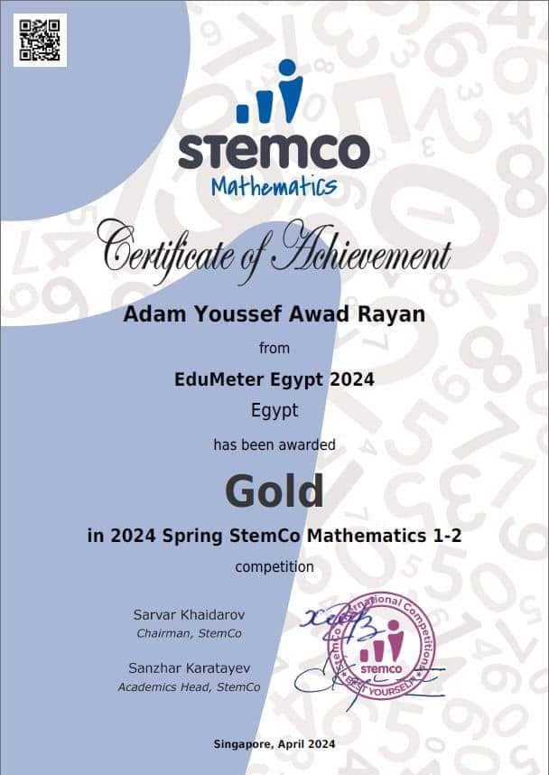 ومن جهته، قدم الدكتور أحمد يحيى مدير عام إدارة غرب المنصورة التعليمية بخالص التهانى إلى الطالب النابغة وكل التحية لأبويه وأسرته لتشجيعه ورعايته وحرصهم على مشاركته فى المسابقة متمنيا له مزيدا من التفوق والتقدم.
