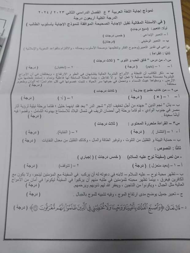 نموذج إجابة امتحان اللغة العربية للشهادة الإعدادية 2024 بالقاهرة