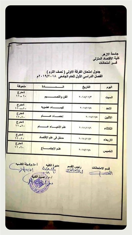 أعلنت كلية الاقتصاد والعلوم المنزلى بجامعة الأزهر فرع طنطا، عن بدء امتحانات الـ"ميد ترم" فى الثالث من نوفمبر المقبل لجميع الفرق الأربعة.