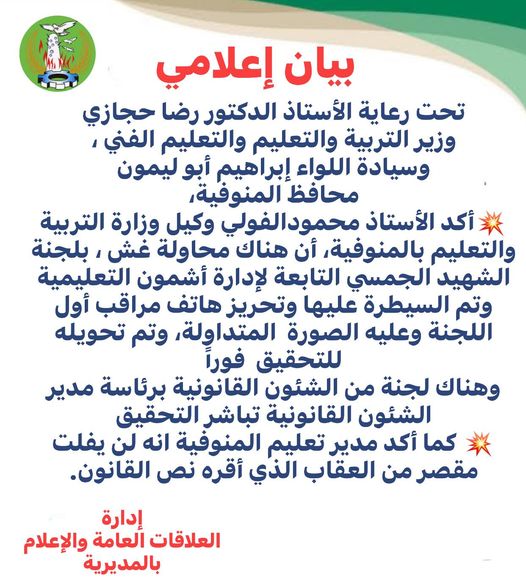 أكد محمود الفولي وكيل وزارة التربية والتعليم بالمنوفية، أن هناك محاولة غش، بلجنة الشهيد الجمسي التابعة لإدارة أشمون التعليمية وتم السيطرة عليها وتحريز هاتف مراقب أول اللجنة وعليه الصورة المتداولة، وتم تحويله للتحقيق فورًا.