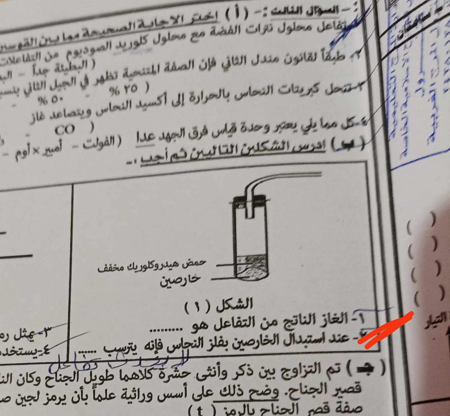 وقد اشتكت ولي امر أن هناك سؤال خارج المنهج في الامتحان هو سؤال الثالث جزئية ب الشكل الاول < عند استبدال الخارصين بفلز النحاس فإنه يترسب …..