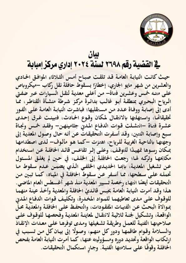 أصدرت النيابة العامة بيان صحفي بشأن القضية رقم ٢٦٩٨ لسنة ٢٠٢٤ إداري مركز إمبابة، المعروفة إعلاميا باسم «حادث معدية أبو غالب»