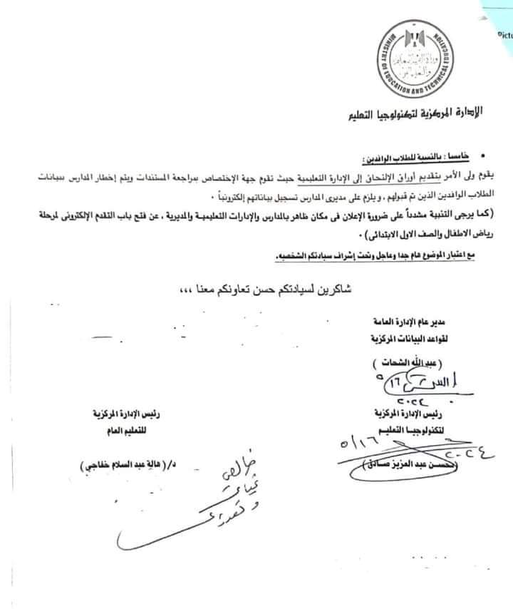 - ويلزم الإطلاع على شهادة الميلاد المميكنه للطفل المتقدم وبطاقة الرقم القومى لولى الأمر.
