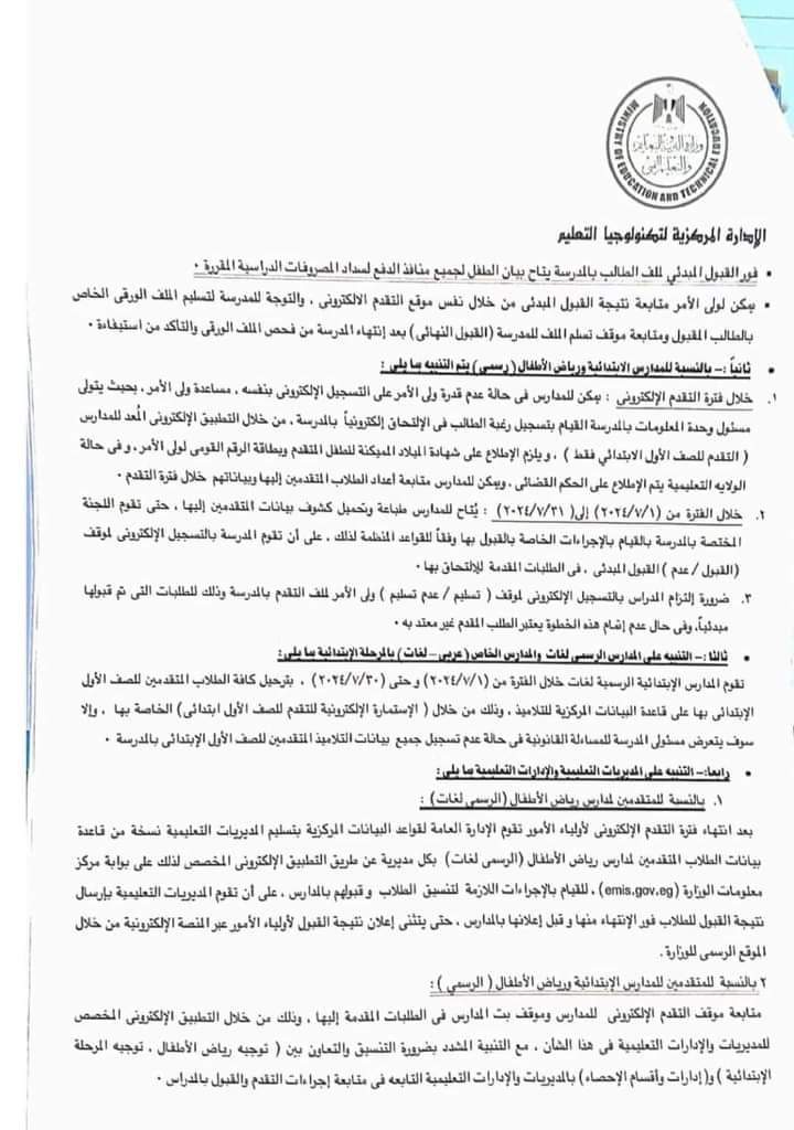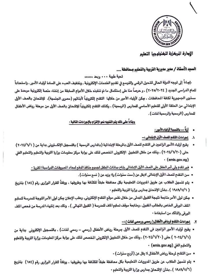 - يقوم أولياء الأمور الراغبين في التقدم للصف الأول بمرحلة رياض الأطفال (رسمي - رسمي لغات)، بالتسجيل الإلكتروني بداية من (٢٠٢٤/٦/١ ) حتى ( ٢٠٢٤/٦/٢٠)، وذلك من خلال التطبيق الإلكتروني المخصص لذلك على بوابة مركز المعلومات وزارة التربية والتعليم والتعليم الفني (emis.gov.eg).