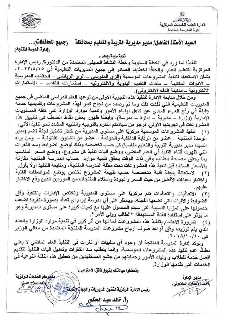عممت وزارة التربية والتعليم والتعليم الفني، خطابا على المديريات التعليمية، تنفيذا لما ورد في الخطة السنوية وخطة النشاط الصيفي المعتمدة من الدكتورة رئيس الإدارة المركزية للتعليم العام، والحاقا لخطابنا الصادر إلى جميع المديريات التعليمية في ٢٠٢٣/٥/١٥، بشأن الاستعداد لتنفيذ المشروعات الموسمية الزى المدرسي - الزي الرياضي - الحقائب المدرسية الأدوات المكتبية ملفات التقديم اليدوية الإلكترونية استمارات التقديم - الاستمارات الإلكترونية - ماكينة الدفع الالكتروني).