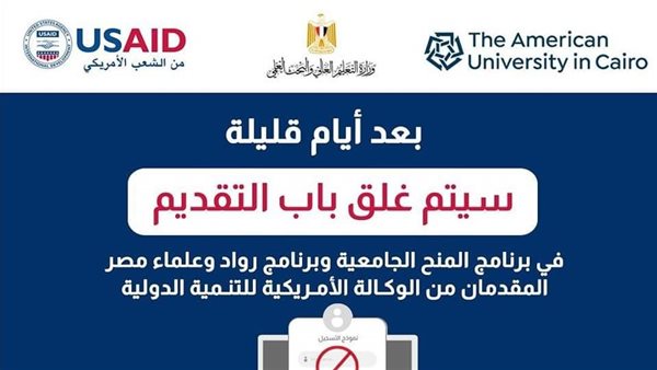 وأشارت إلى أنه بعد أيام قليلة، سيتم غلق باب التقديم في برنامج المنح الجامعية وبرنامج رواد وعلماء مصر المقدمان من الوكالة الأمريكية للتنمية الدولية، وبخاصة أن أخر موعد للتقديم: ٣١ مايو ٢٠٢٤.