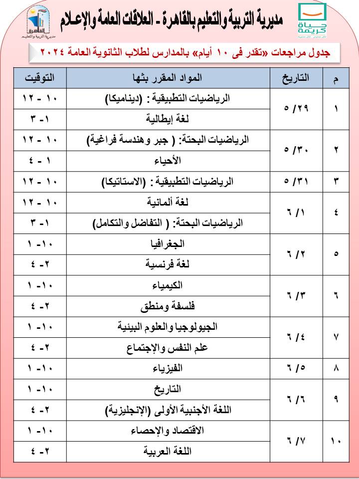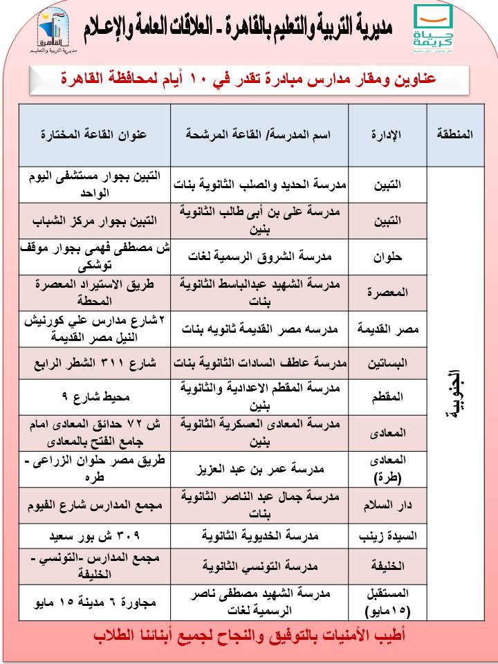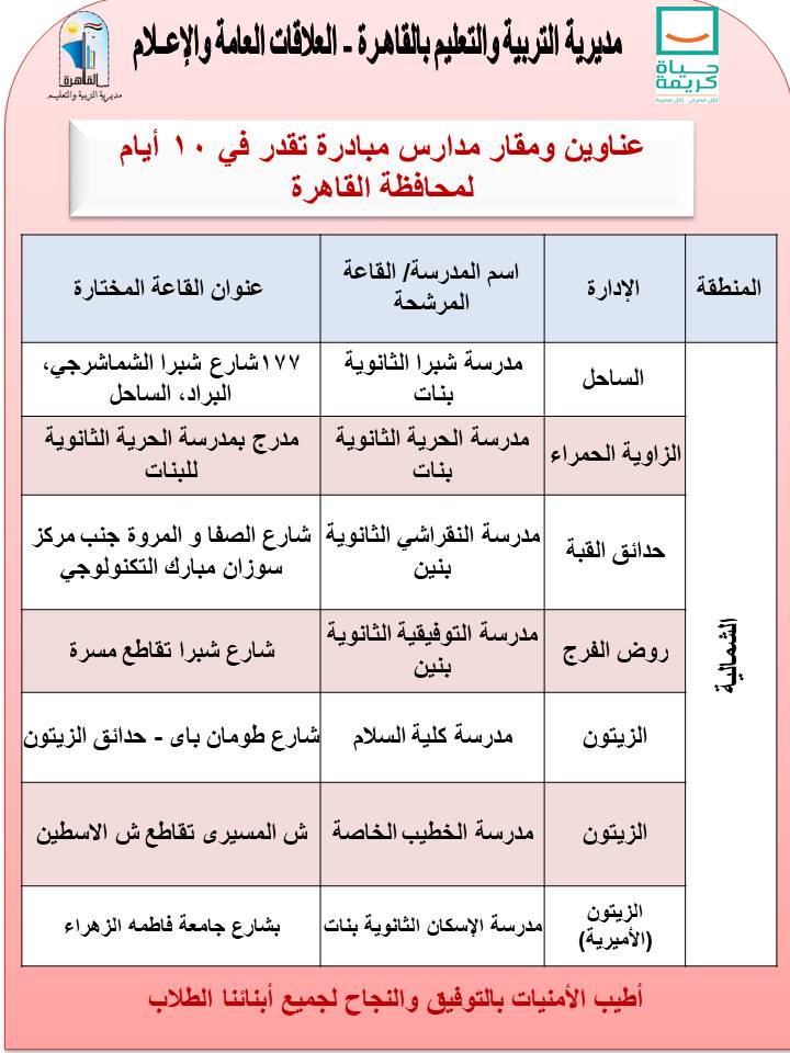 أعلنت مديرية التربية والتعليم بالقاهرة برعاية أيمن موسى، عناوين ومقار مدارس مراجعات الثانوية العامة لمبادرة " تقدر فى ١٠ أيام " فى جميع الإدارات التعليمية، وذلك لضمان تحقيق أقصى استفادة لأبنائنا الطلاب من هذة المراجعات