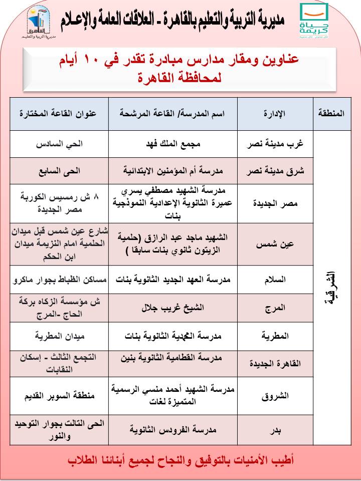 عناوين ومقار مدارس مراجعات الثانوية العامة بالقاهرة لمبادرة "تقدر بـ10 أيام"