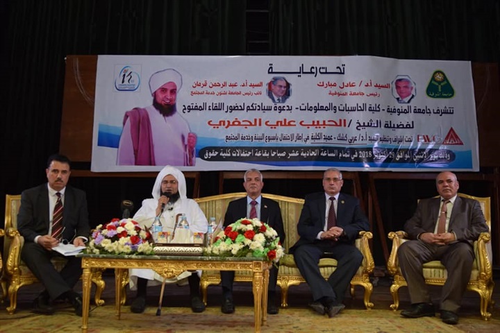 نظمت كلية الحاسبات والمعلومات بجامعة المنوفية، لقاء طلابى مفتوح مع فضيلة الشيخ الحبيب علي الجفري، وذلك في إطار فعاليات الأسبوع البيئى الثقافى بالجامعة، تحت رعاية الدكتور عادل مبارك رئيس الجامعة، والدكتور عبد الرحمن قرمان نائب رئيس الجامعة لشئون خدمة المجتمع وتنمية البيئة، وإشراف الدكتور عربي كشك عميد الكلية والدكتور أسامة عبد الرؤوف وكيل الكلية لشئون خدمة المجتمع وتنمية البيئة.
