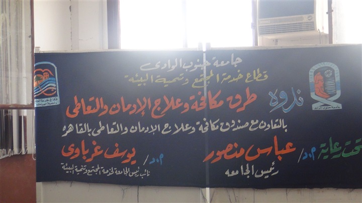 نظم قطاع خدمة المجتمع وتنمية البيئة بكلية التربية النوعية جامعة جنوب الوادي، ندوة بعنوان "طرق مكافحة وعلاج الإدمان"، في إطار التعاون المشترك بين جامعة جنوب الوادي وصندوق مكافحة وعلاج الإدمان والتعاطي بالقاهرة وتحت رعاية الدكتور عباس منصور رئيس الجامعة وإشراف الدكتور يوسف الغرباوي نائب رئيس الجامعة لشئون خدمة المجتمع وتنمية البيئة، وبحضور الدكتور مصطفى أحمد على عميد كلية التربية النوعية.