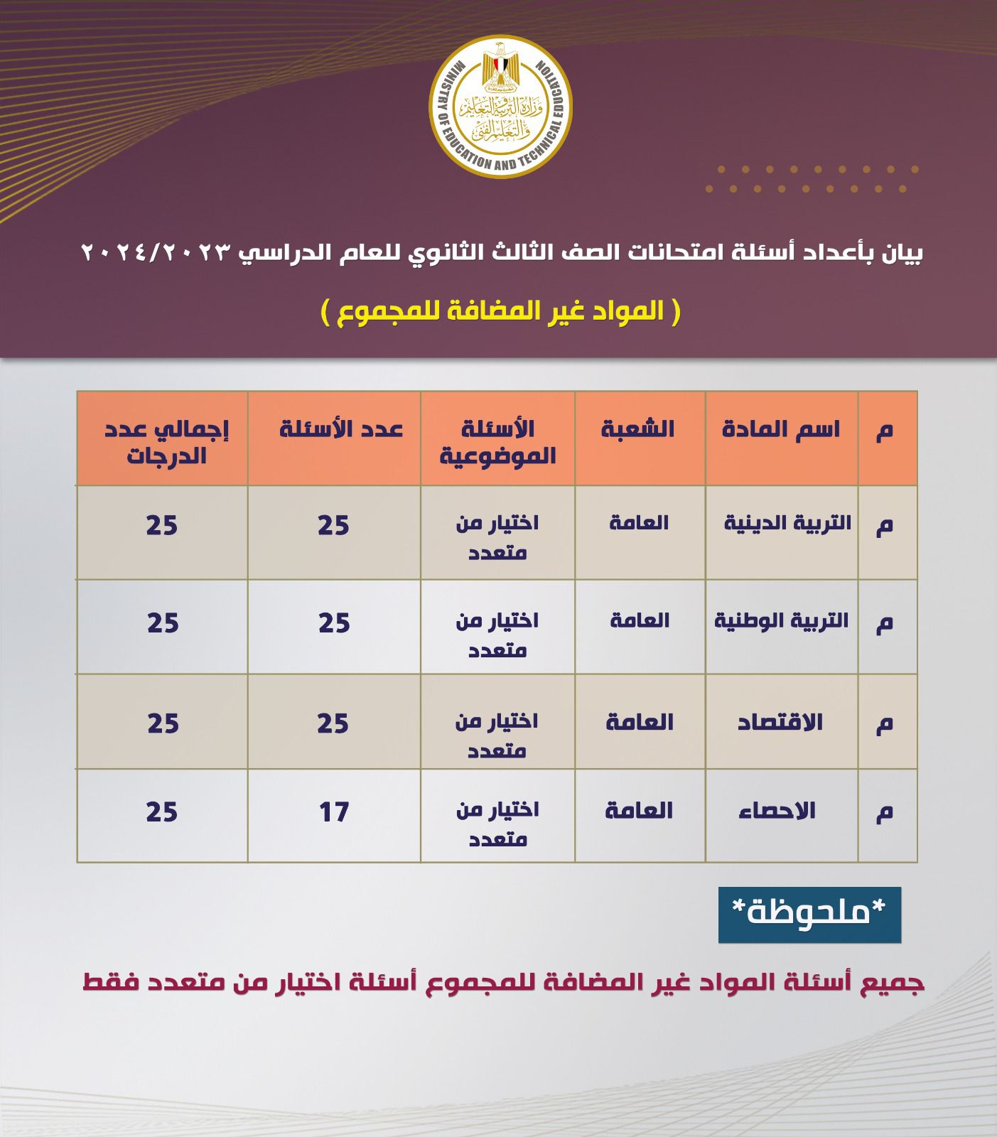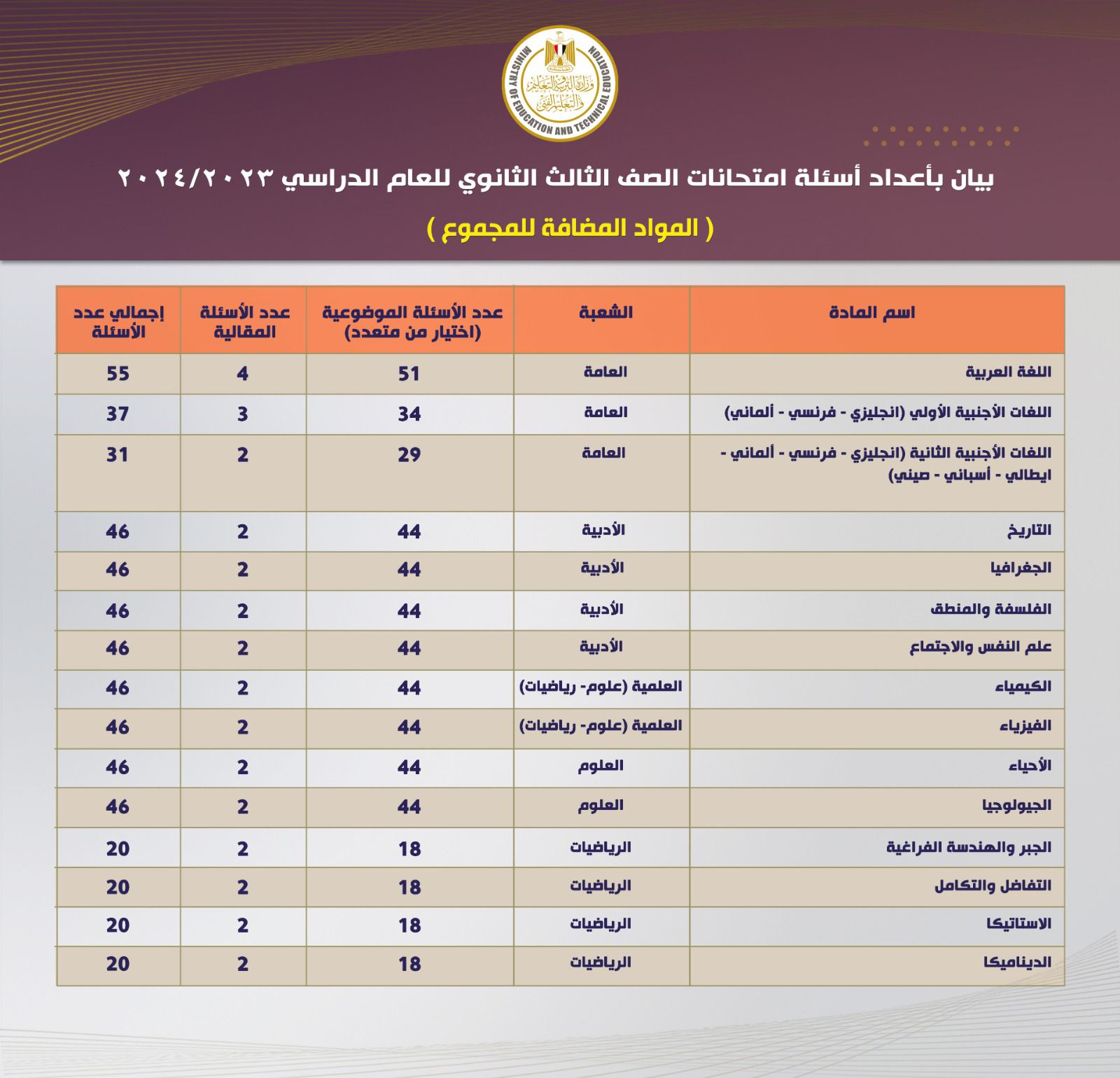 وأوضحت وزارة التربية والتعليم والتعليم الفني عدد وتقسيم الأسئلة في كل مادة خلال امتحانات شهادة الثانوية العامة ٢٠٢٣ / ٢٠٢٤ للمواد المضافة وغير المضافة للمجموع كما يلي: