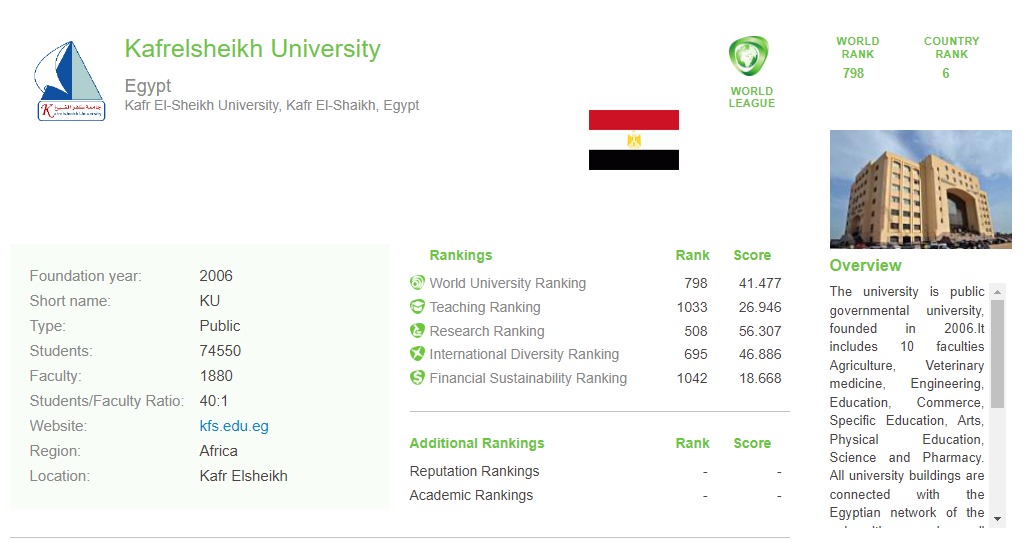 حيث جاء ترتيب جامعة كفرالشيخ في مجال البحث العلمي المركز الأول محليًا و508 عالميًا، وفي مجال التدريس حققت الجامعة المركز 13 محليًا و1033 عالميًا، وفي مجال التنوع الدولي حققت الجامعة المركز الثامن محليًا و695 عالميًا، وفي مجال الاستدامة جاءت الجامعة في المرتبة 13 محليًا و1042 عالميًا.