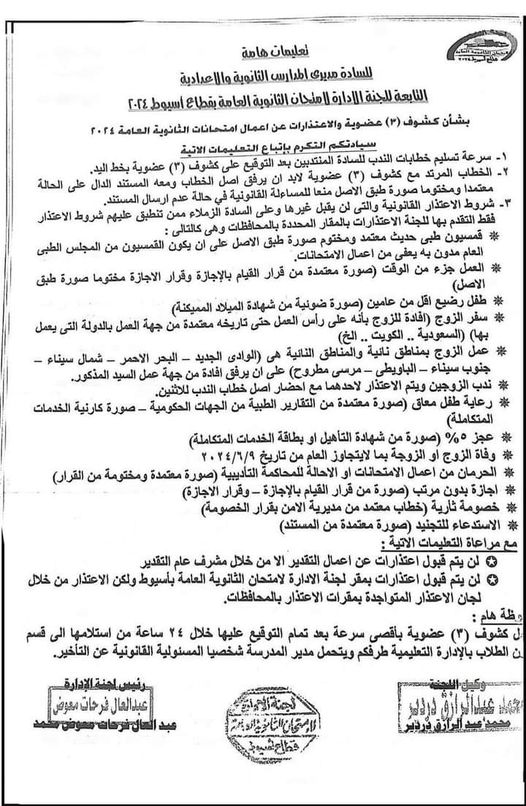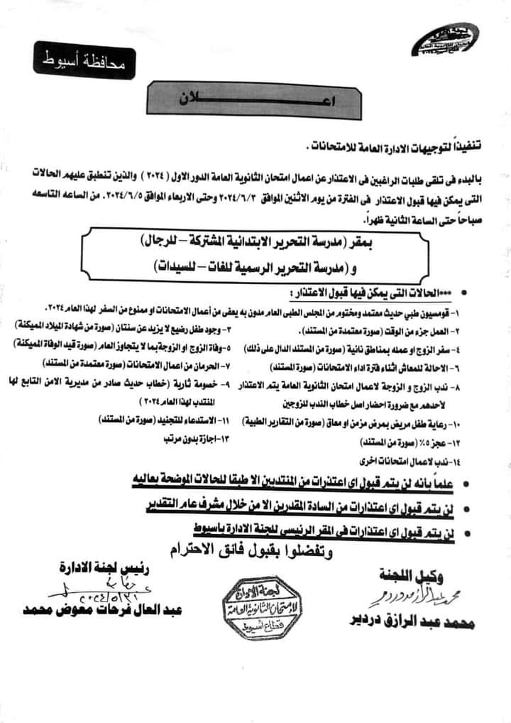 - لن يتم قبول اعتذارات بمقر لجنة الادارة لامتحان الثانوية العامة بأسيوط ولكن الاعتذار من خلال لجان الاعتذار المتواجدة بمقرات الاعتذار بالمحافظات.