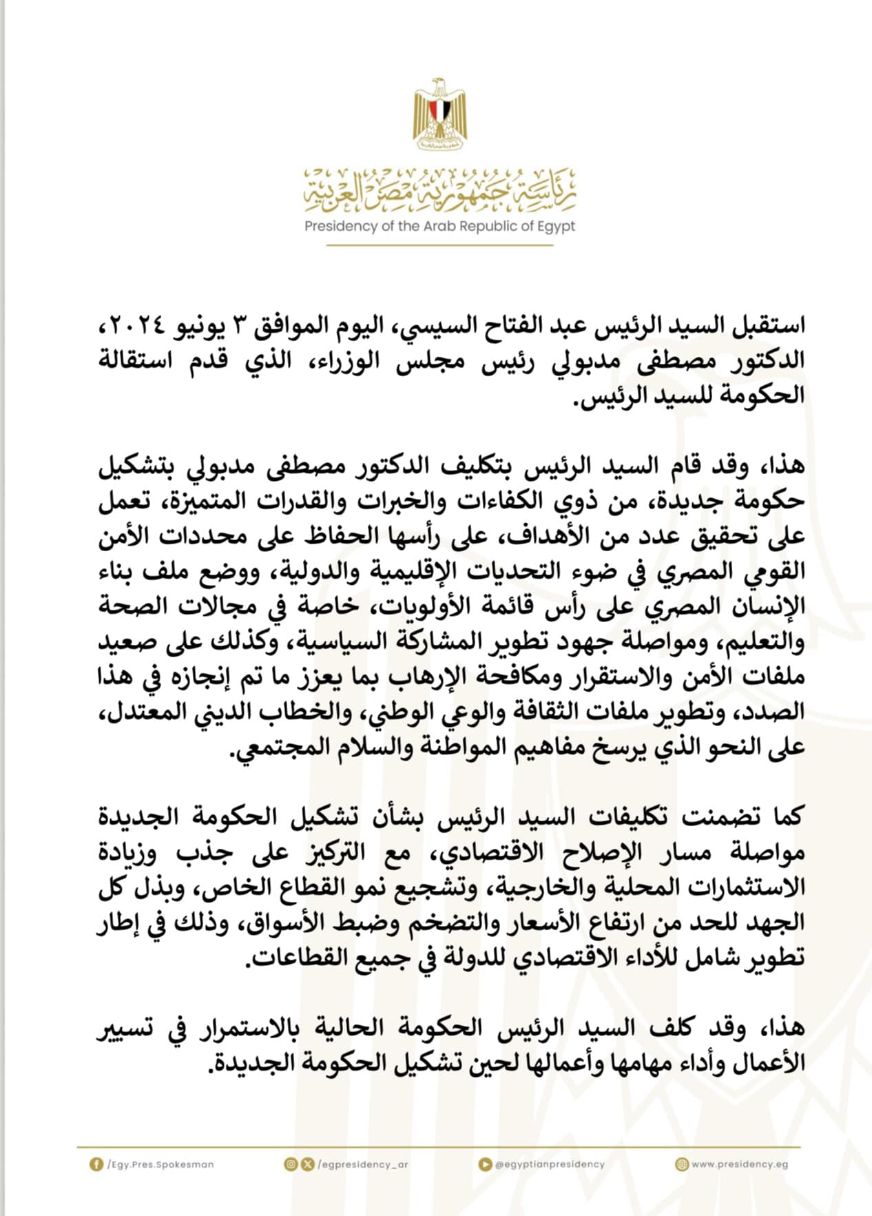 هذا، وقد كلف الرئيس عبدالفتاح السيسي، الحكومة الحالية بالاستمرار في تسيير الأعمال وأداء مهامها وأعمالها لحين تشكيل الحكومة الجديدة.
