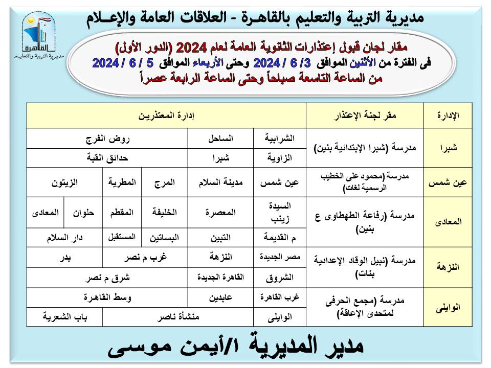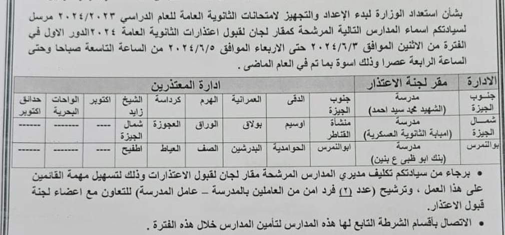 ومن جهته، أكد أشرف سلومة وكيل وزارة التربية والتعليم بالجيزة، بأنه تم تحديد عدد من مقار اعتذار الثانوية العامة بداية من اليوم الاثنين الموافق ٣ يونيو حتى يوم الاربعاء الموافق ٥ يونيو ٢٠٢٤.