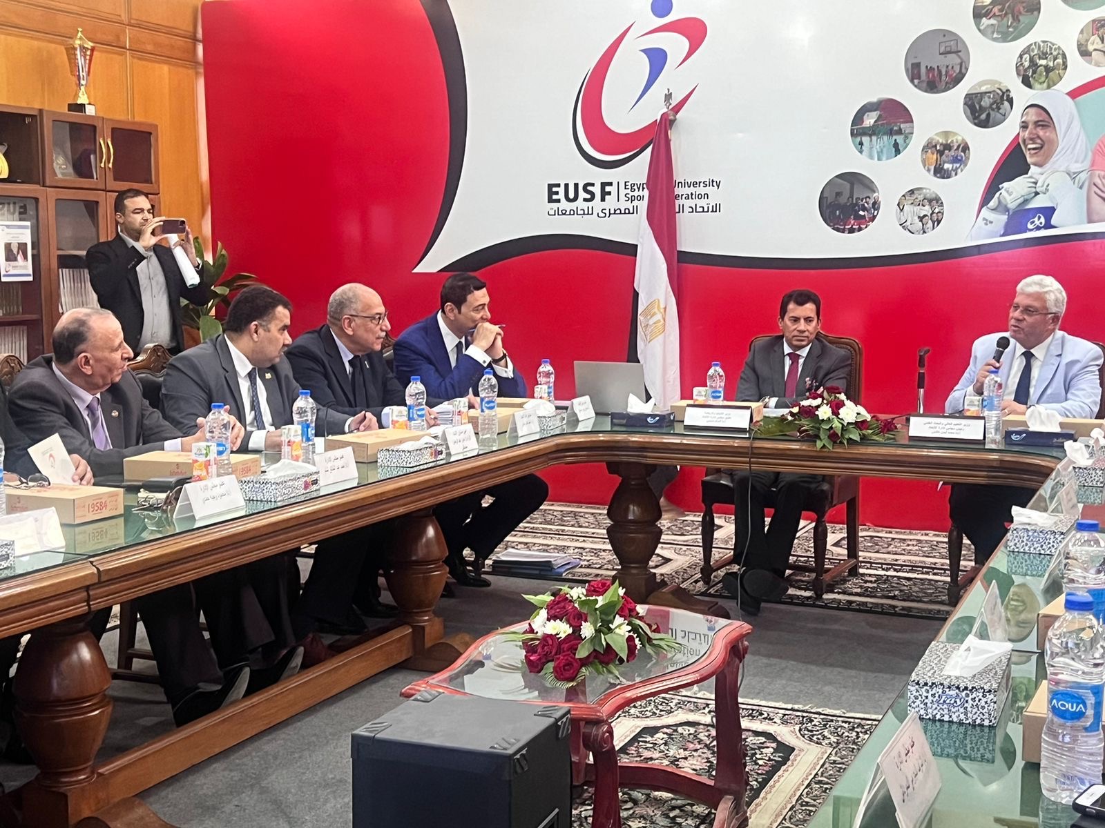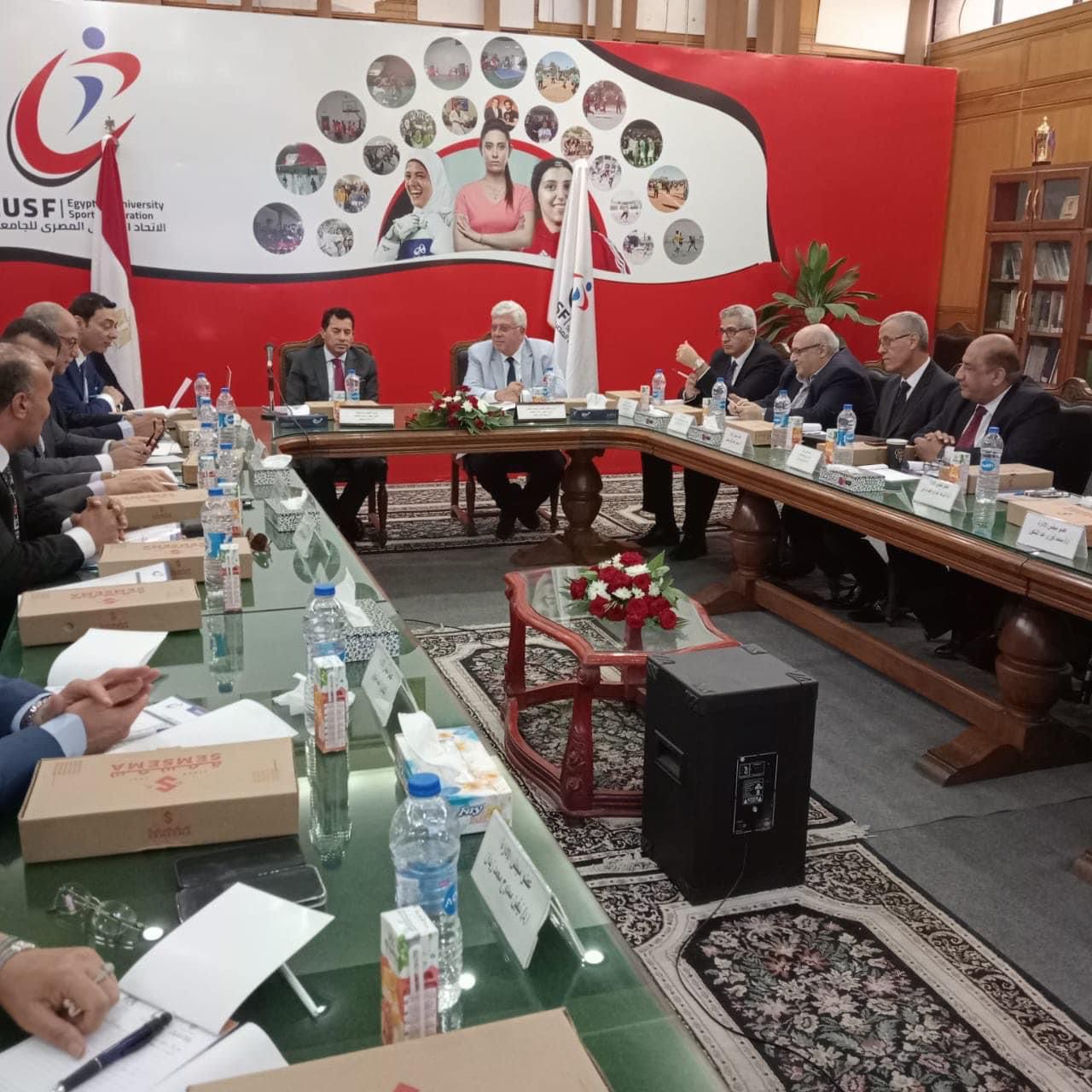 عقد مجلس إدارة الاتحاد الرياضي المصري للجامعات اجتماعه الأول بتشكيله الجديد برئاسة الدكتور أيمن عاشور وزير التعليم العالي والبحث العلمي، بحضور الدكتور أشرف صبحي وزير الشباب والرياضة، والدكتور مصطفى بيومي مساعد وزير التعليم العالي للحياة الطلابية والتنمية المستدامة ونائب رئيس الاتحاد الرياضي المصري للجامعات وأعضاء المجلس الموقر، في مقر الاتحاد بالمدينة الجامعية بجامعة القاهرة.