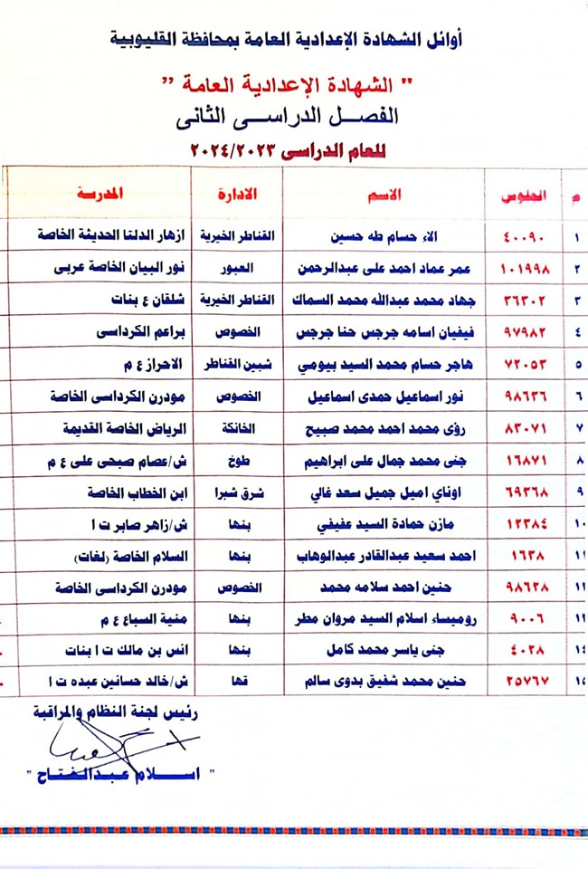 أما عن أوائل امتحانات الشهادة الإعدادية الترم الثاني 2024 بالقليوبية فجاءت أسمائهم كالآتي: