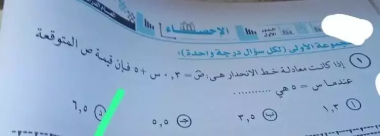 إذا كانت معادلة الانحدار هي: ص^ = ٠،٣ س + ٥ فإن قيمة ص المتوقعة عندما س = ٥ هي........ د ( ٦،٥ )