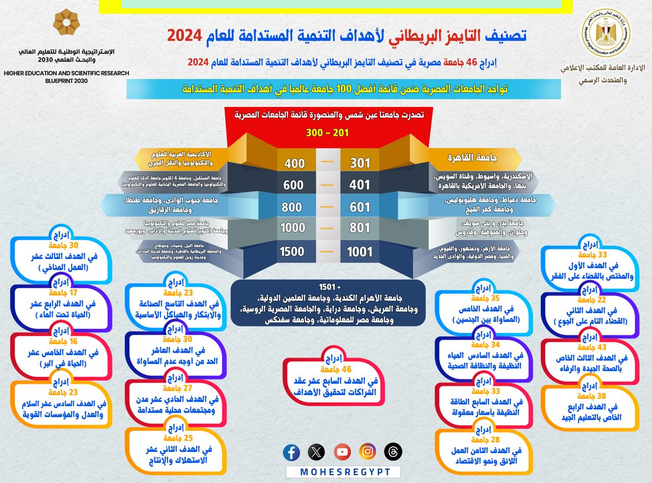 عاجل.. إدراج 46 جامعة مصرية في تصنيف التايمز للتنمية المستدامة 2024