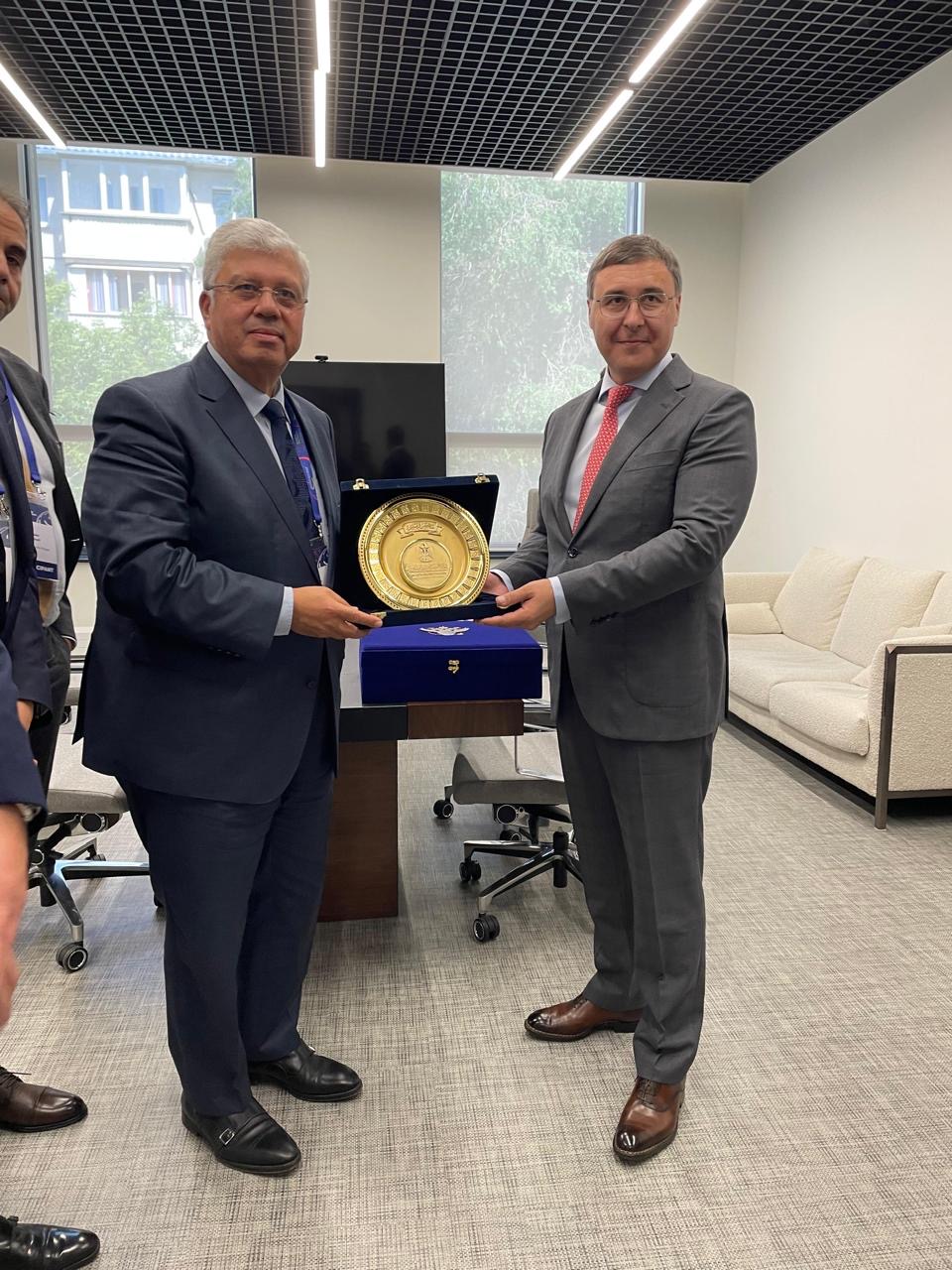 عقد الدكتور أيمن عاشور وزير التعليم العالي والبحث العلمي، لقاءًا مع الدكتور فاليري فالكوف وزير التعليم العالي والعلوم الروسية، وذلك على هامش مشاركته فى فعاليات الاجتماع الحادي عشر لوزراء التعليم العالي في الدول أعضاء تجمع البريكس، الذي عقُد بمدينة كازان الروسية.