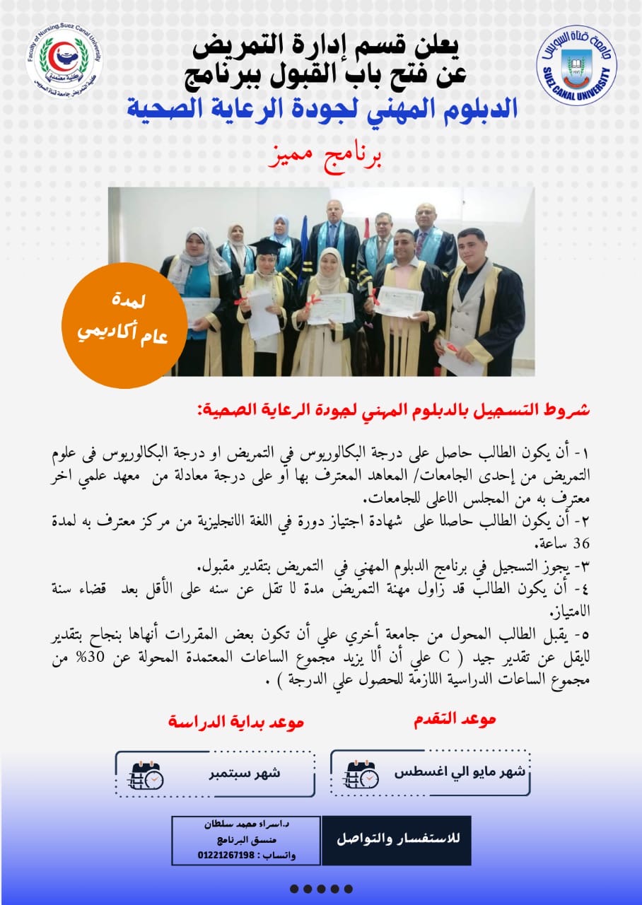 جدير بالذكر أن فتح باب التقديم لبرنامج الدبلوم المهني لجودة الرعاية الصحية بقسم إدارة التمريض بكلية التمريض جامعة قناة السويس بدأ شهر مايو الماضي ويستمر حتى أغسطس المقبل على أن تبدأ الدراسة في شهر سبتمبر.