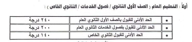 وتقرر أن يكون الحد الأدنى للقبول بالثانوي العام (240) درجة، والثانوي العام خدمات (200) درجة، والثانوي الخاص (140) درجة، مشيرًا إلى أن أعداد الفصول المتاحة للقبول بالصف الأول الثانوي للعام الدراسي القادم 1207 فصل دراسي يستوعب 53028 طالب وطالبة.