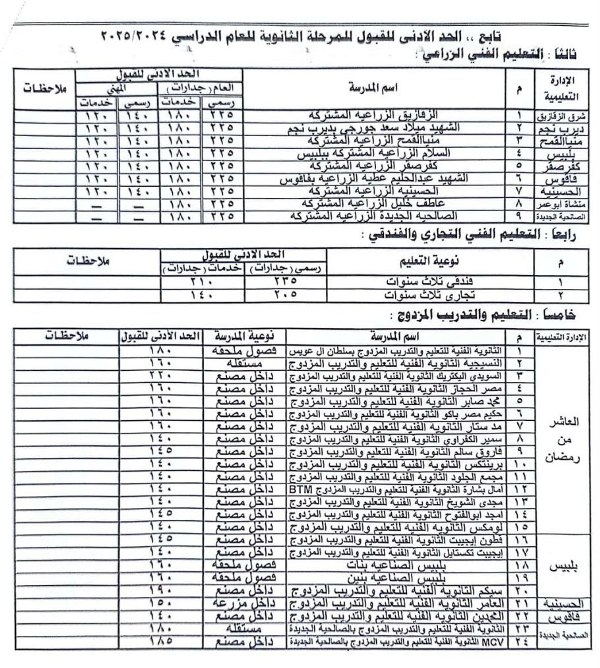 كما اعتمد المحافظ تنسيق القبول بالمرحلة الثانوية للتعليم الفني للعام الدراسي 2024 /2025 م وتقرر أن يكون الحد الأدنى لكل نوعية من نوعيات التعليم الفني (صناعي – زراعي – تجاري) ومدارس التعليم والتدريب المزدوج طبقًا للكشوف المرفقة.