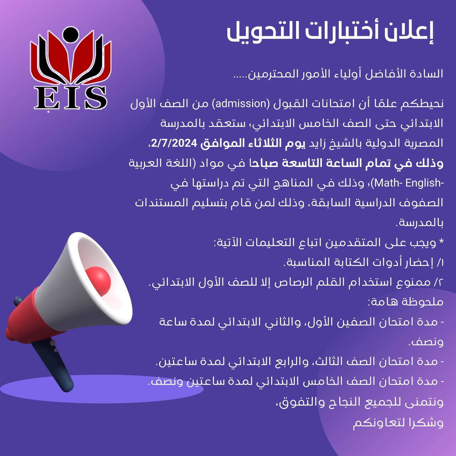 أوضحت المدرسة الدولية بالشيخ زايد، أن امتحانات القبول (admission) من الصف الأول الابتدائي حتى الصف الخامس الابتدائي؛ ستعقد بالمدرسة المصرية الدولية بالشيخ زايد يوم الثلاثاء الموافق 2/7/2024، وذلك في تمام الساعة التاسعة صباحا في مواد (اللغة العربية -Math- English).