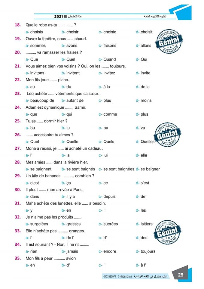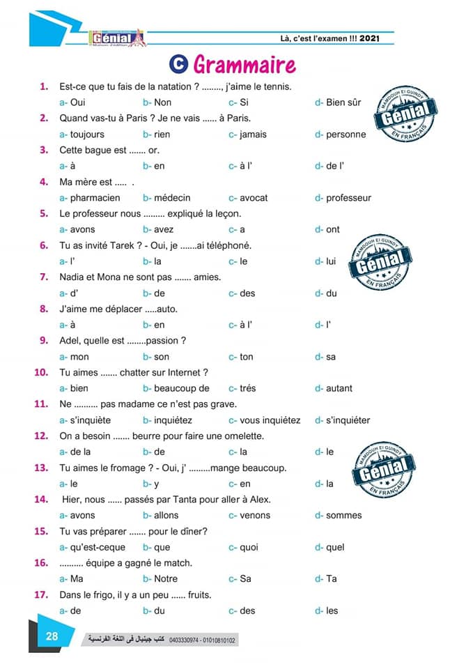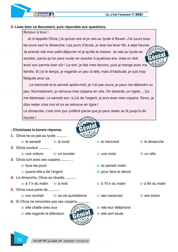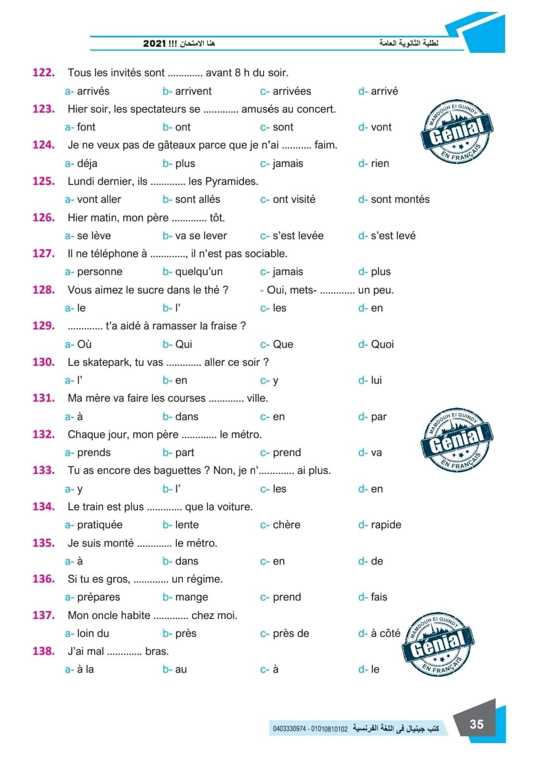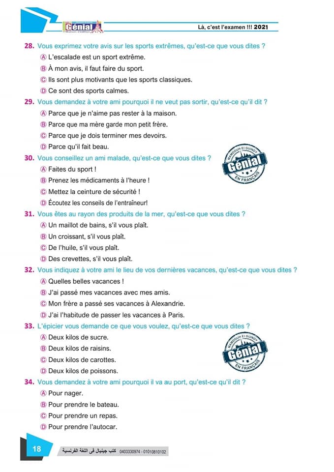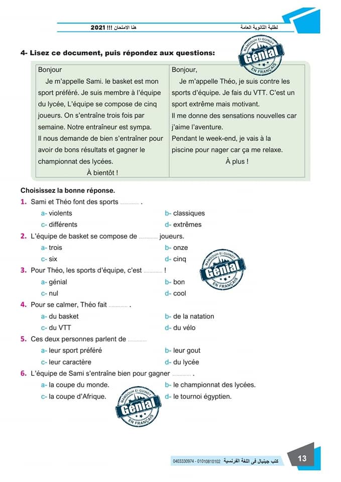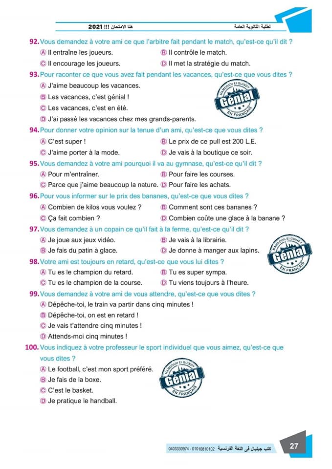 ونقدم لكم مراجعة ليلة الامتحان في مادة اللغة الفرنسية للثانوية العامة ٢٠٢٤م من كتب جينيال: