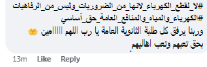 وعلقت أخرى: لا لـ قطع الكهرباء لأنها من الضروريات وليس من الرفاهيات، مفعلة هاشتاج «#الكهرباء_والمياه_والمنافع_العامة_حق_أساسي»، كما وجهت دعوة للطلاب قائلة: ربنا يرفق كل طلبة الثانوية العامة يا رب اللهم امين.