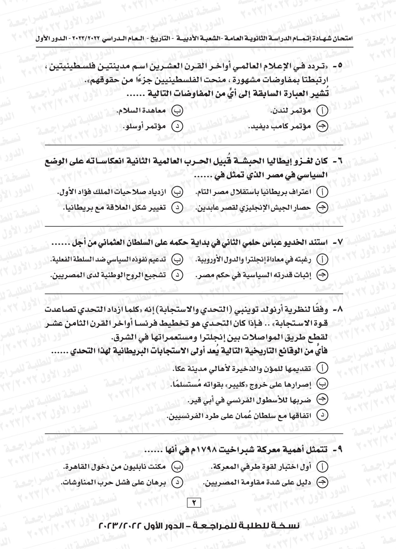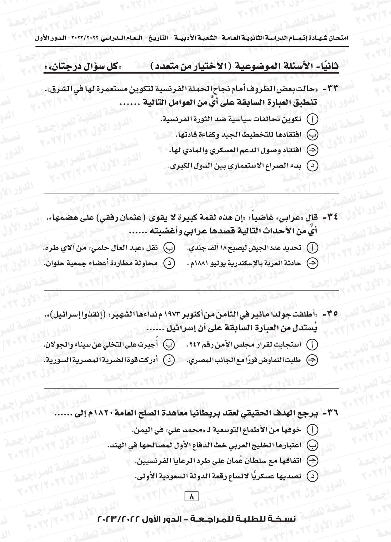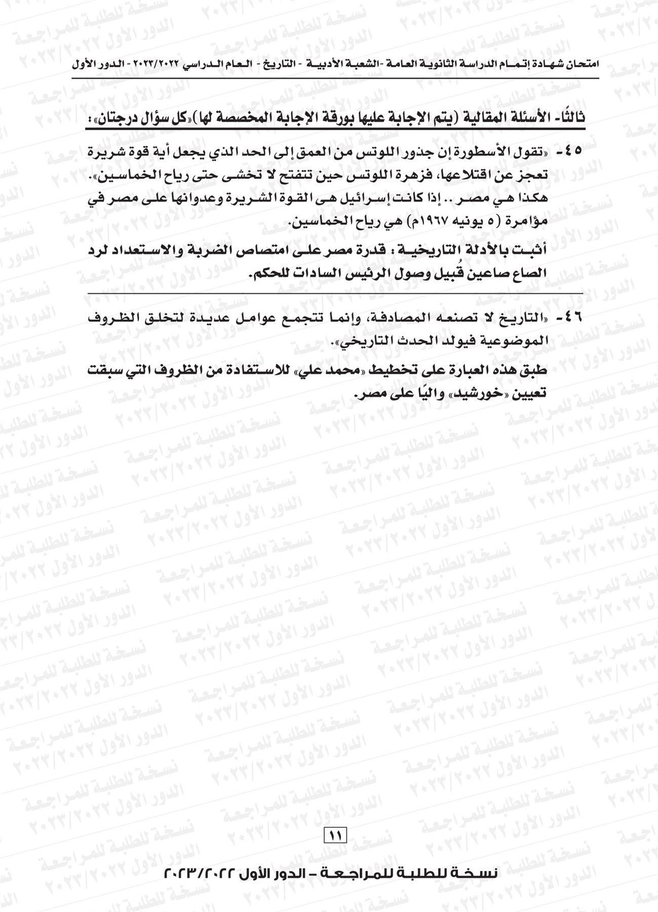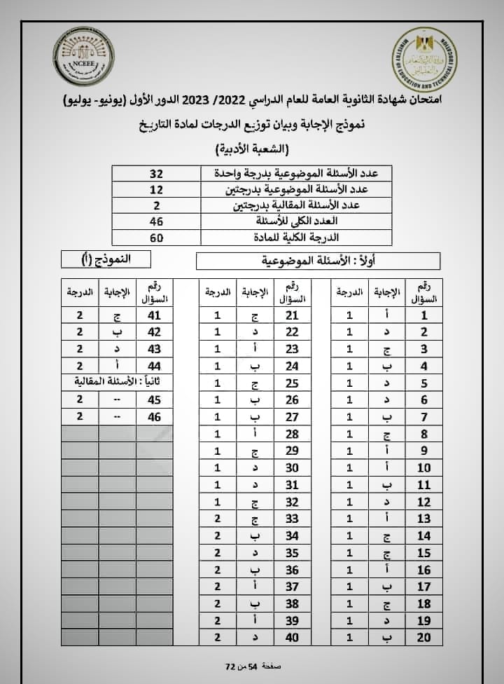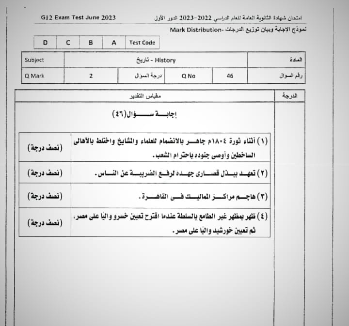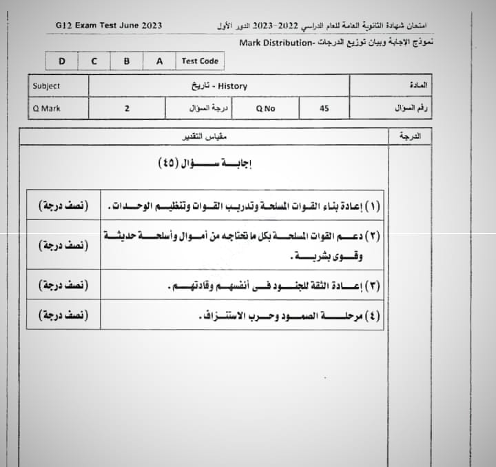 ونقدم لكم نموذج لامتحان التاريخ للثانوية العامة العام الماضي 2023 بإجابتها النموذجية: