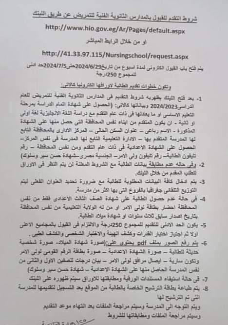 ويأتى موعد التقدم للقبول في المدارس الثانوية الفنية للتمريض فى الفترة من 2024/6/29 حتى 2024/7/5 بمجموع (250).