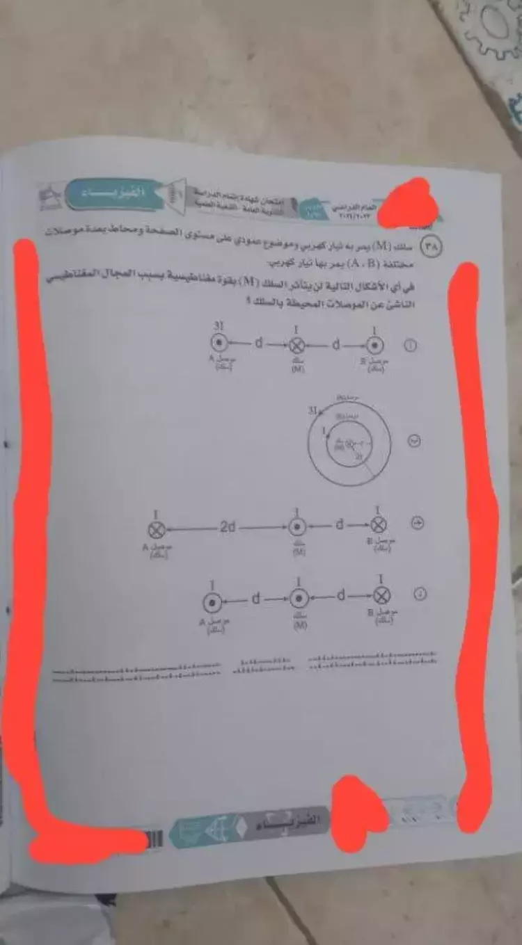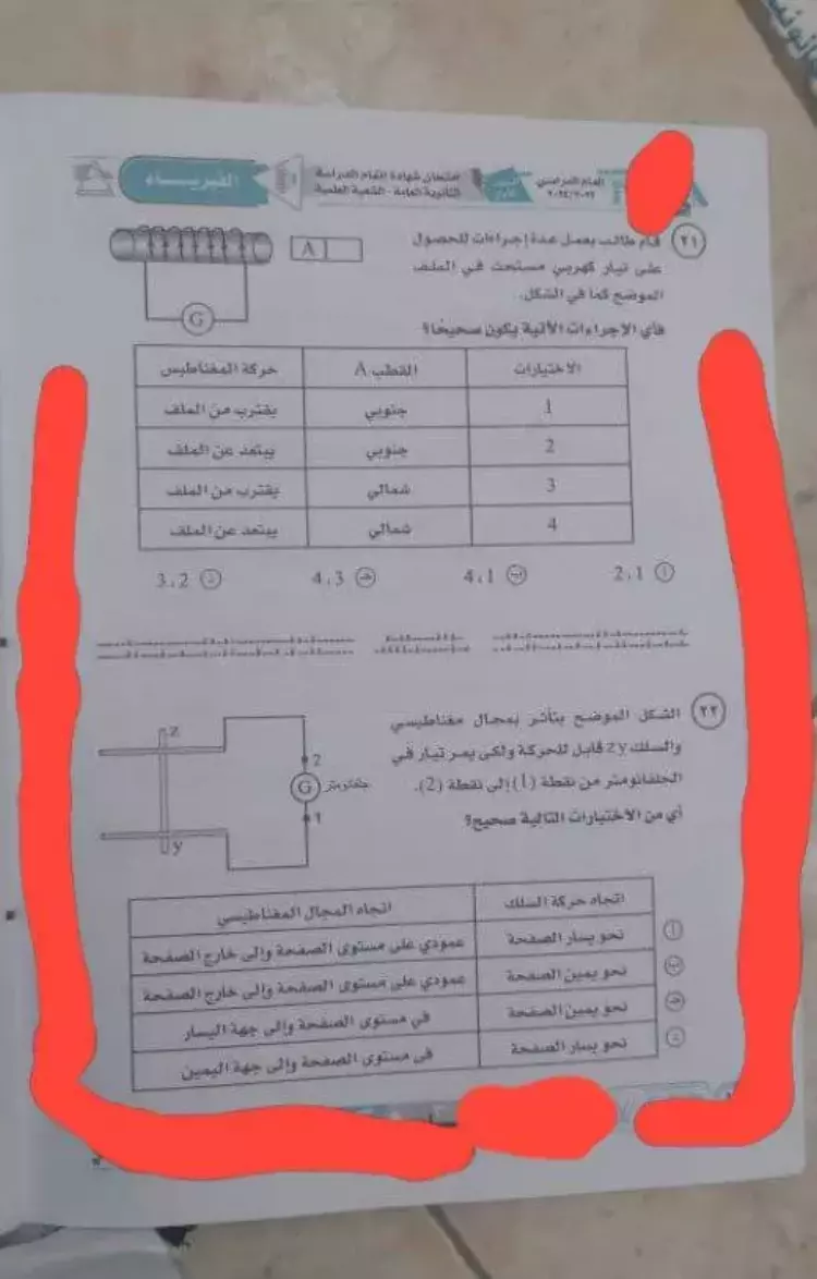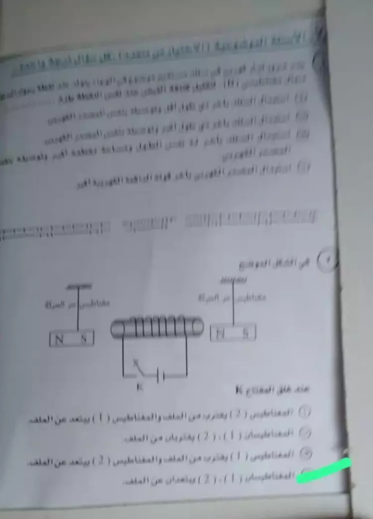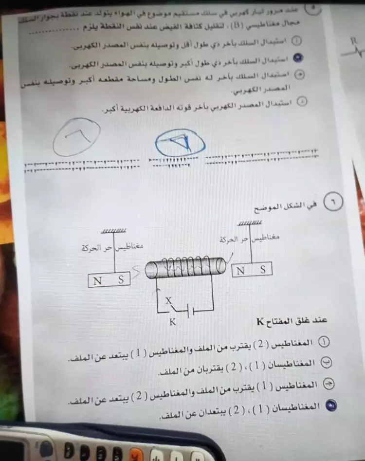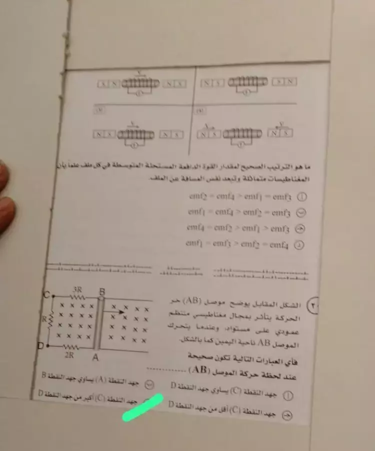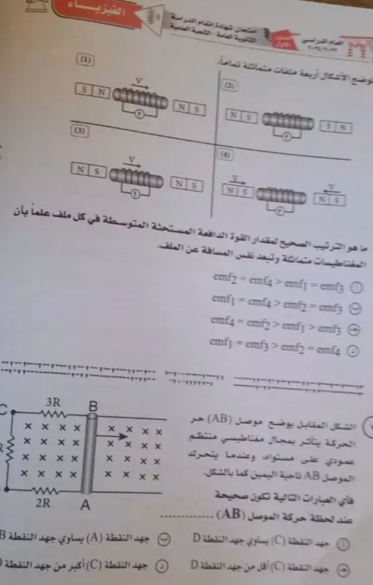 اتجاه حركة السلك نحو يسار الصفحة واتجهت المغناطيس نحو يسار مستوى الصفحة والى يسار الصفحة.. الإجابة اتجاه حركة السلك نحو اليمين واتجهت المغناطيس عمودي على مستوى الصفحة والى خارج الصفحة.