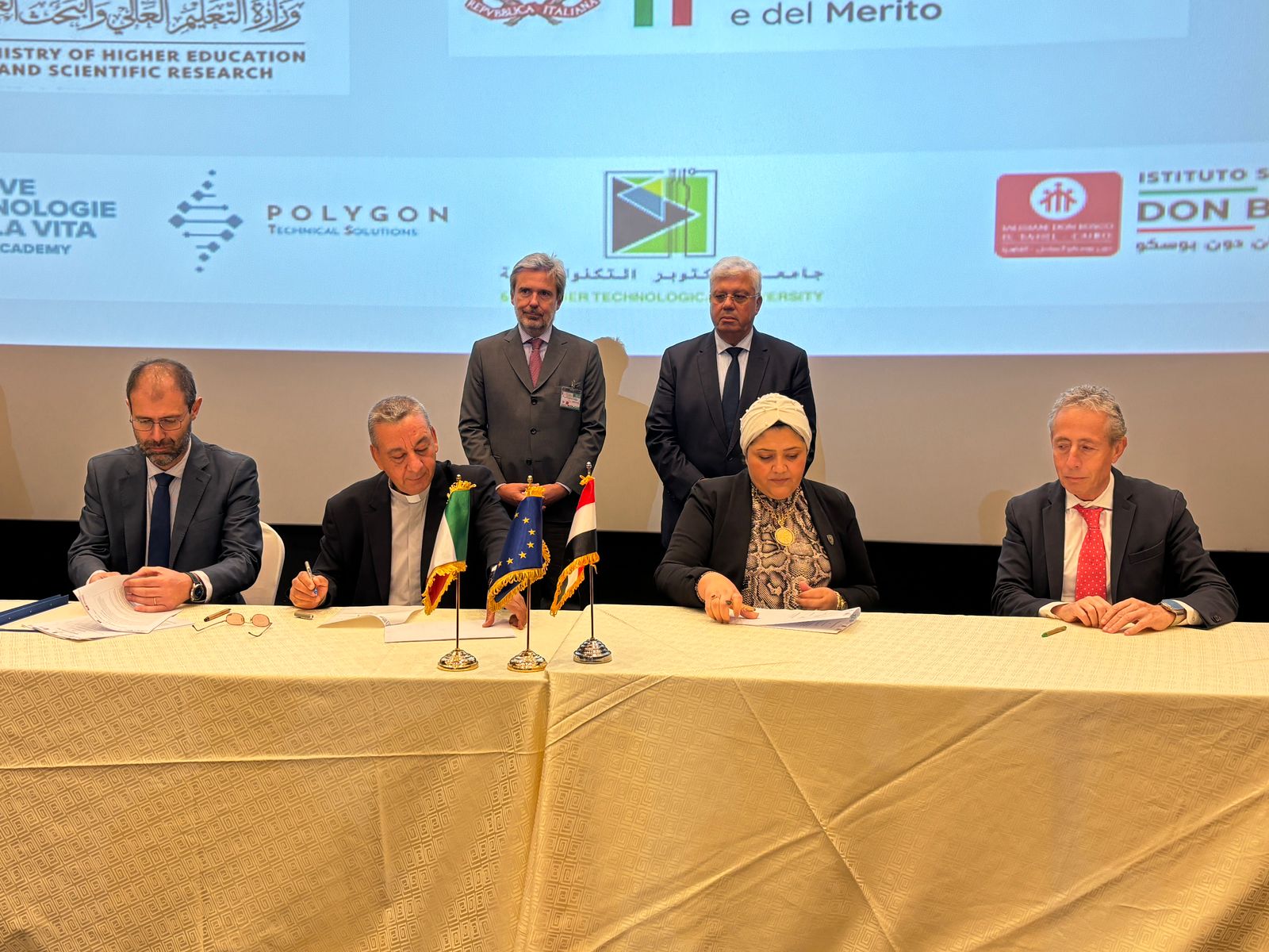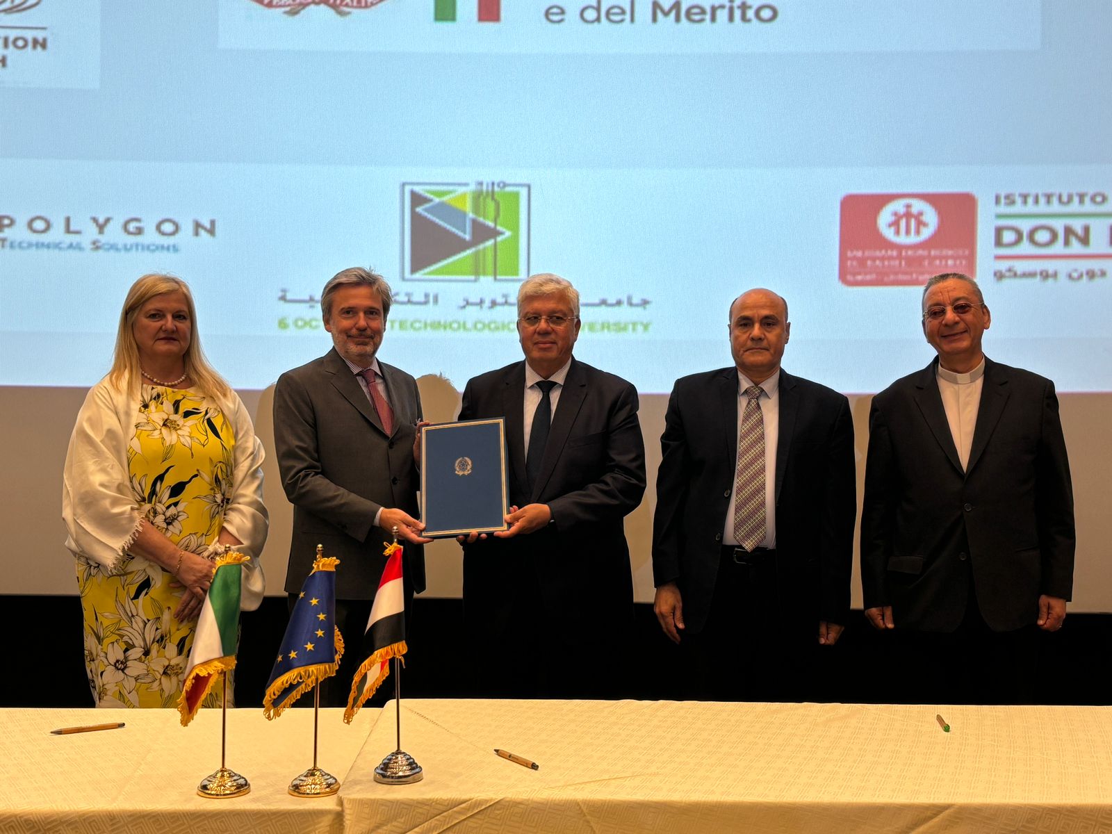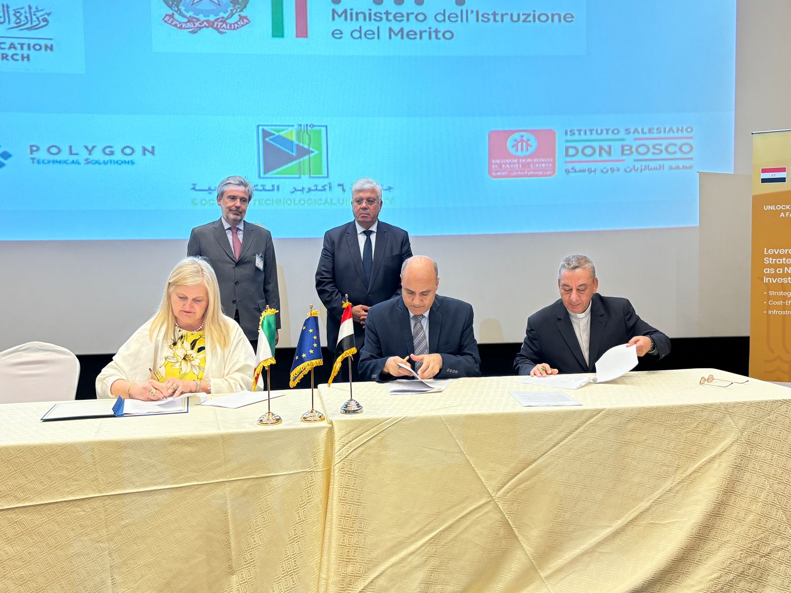 كما شهد وزير التعليم العالي والبحث العلمي والسفير الإيطالي توقيع مذكرة تفاهم بين جامعة 6 أكتوبر التكنولوجية والمعهد التقني العالي للتقنيات الجديدة للصنع في إيطاليا وشركة بوليجون سوليوشنز الإيطالية ومعهد الدون بوسكو في برنامج التكنولوجيا الطبية الحيوية.
