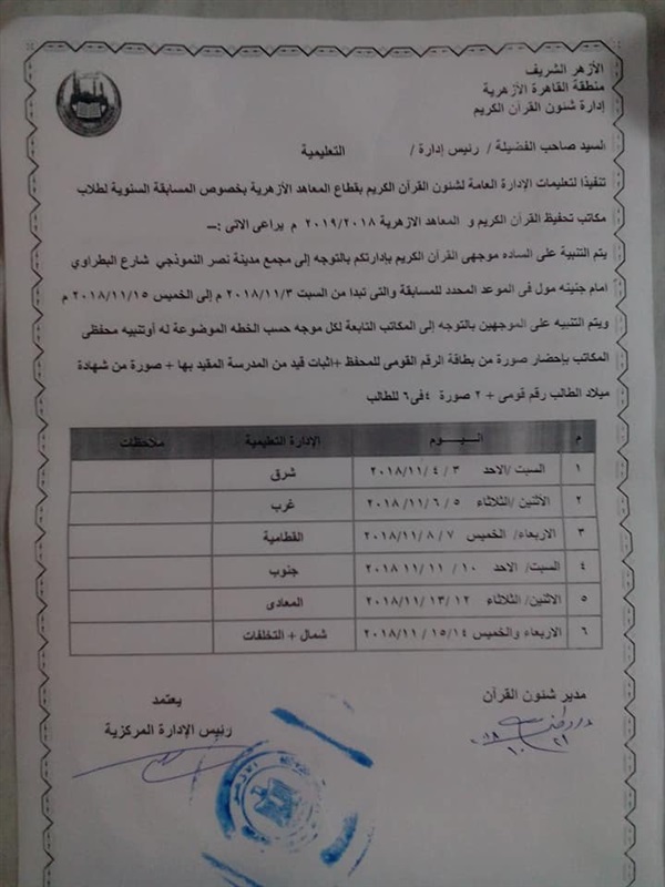 الإدارة العامة لشئون القرآن الكريم بقطاع المعاهد الأزهرية بخصوص المسابقة السنوية