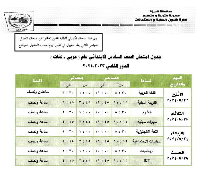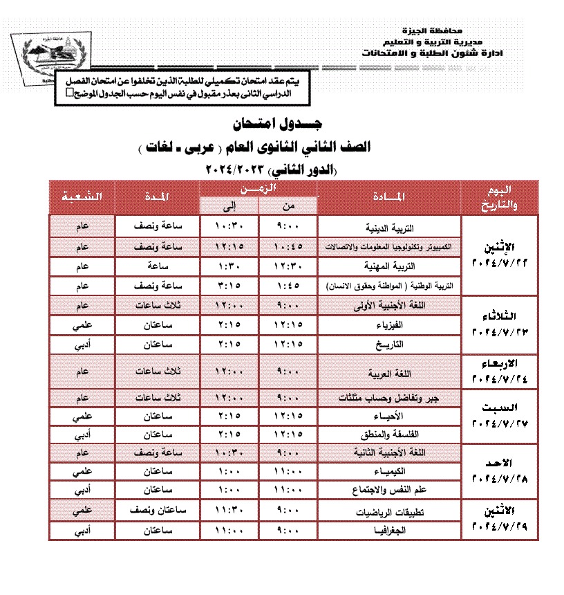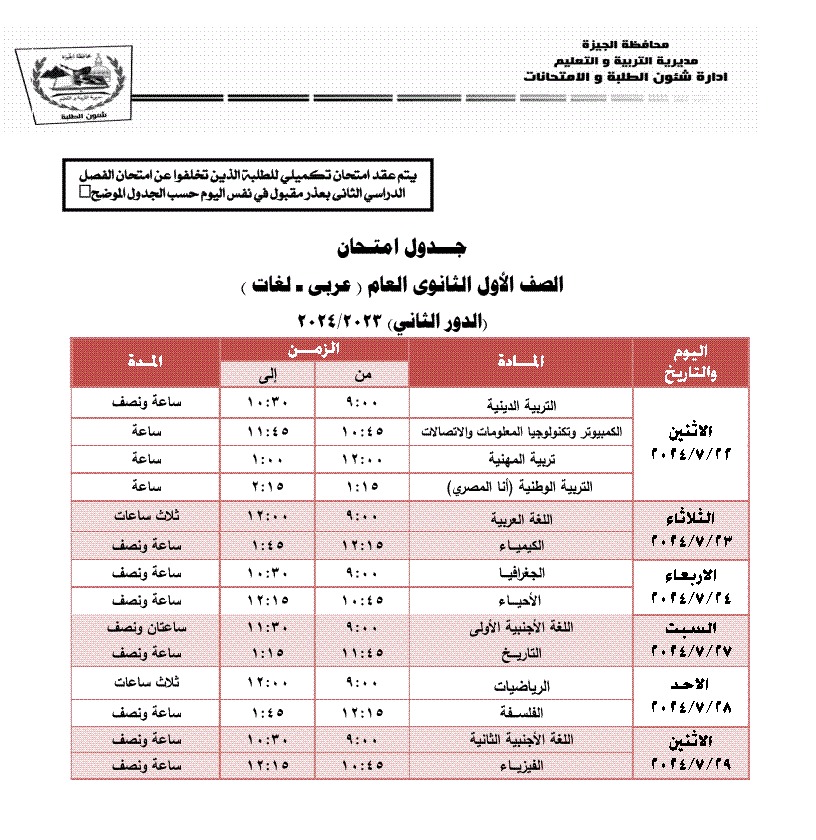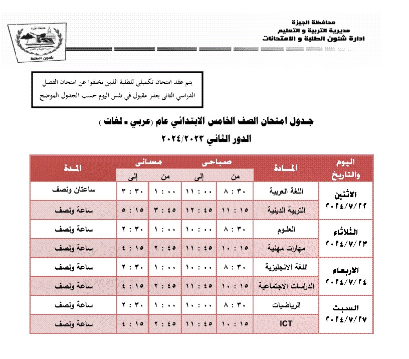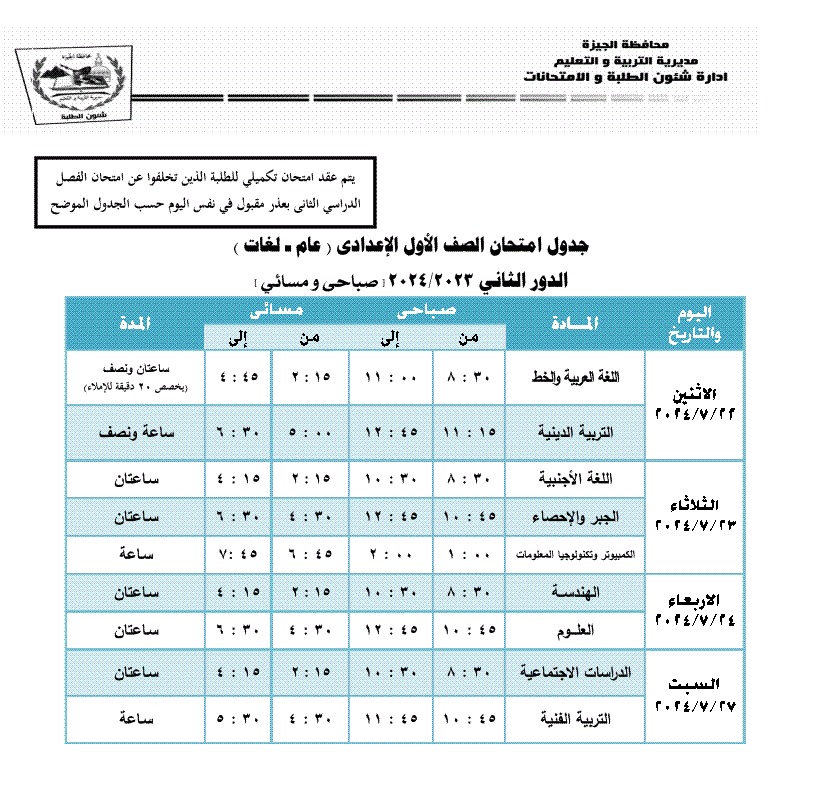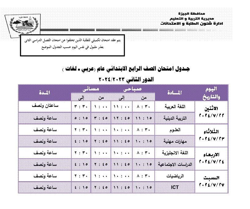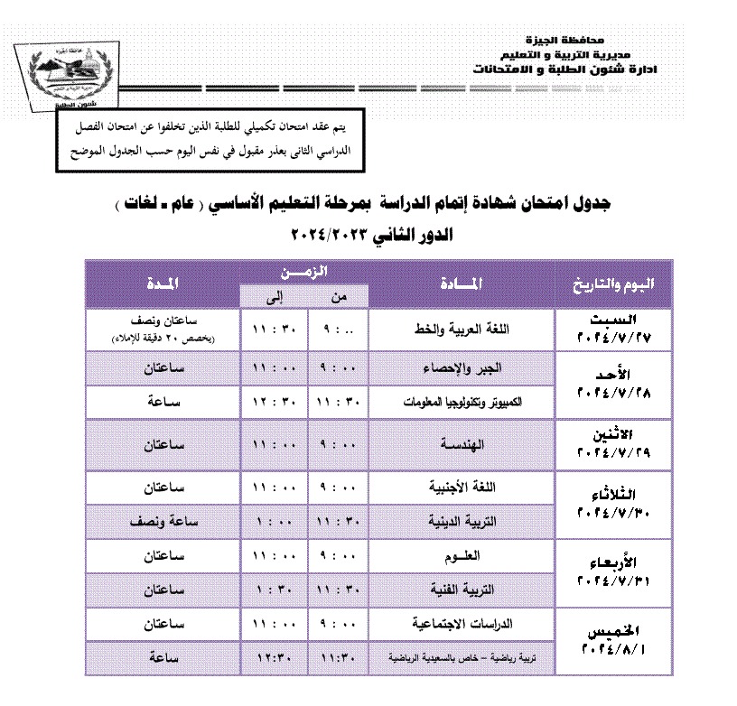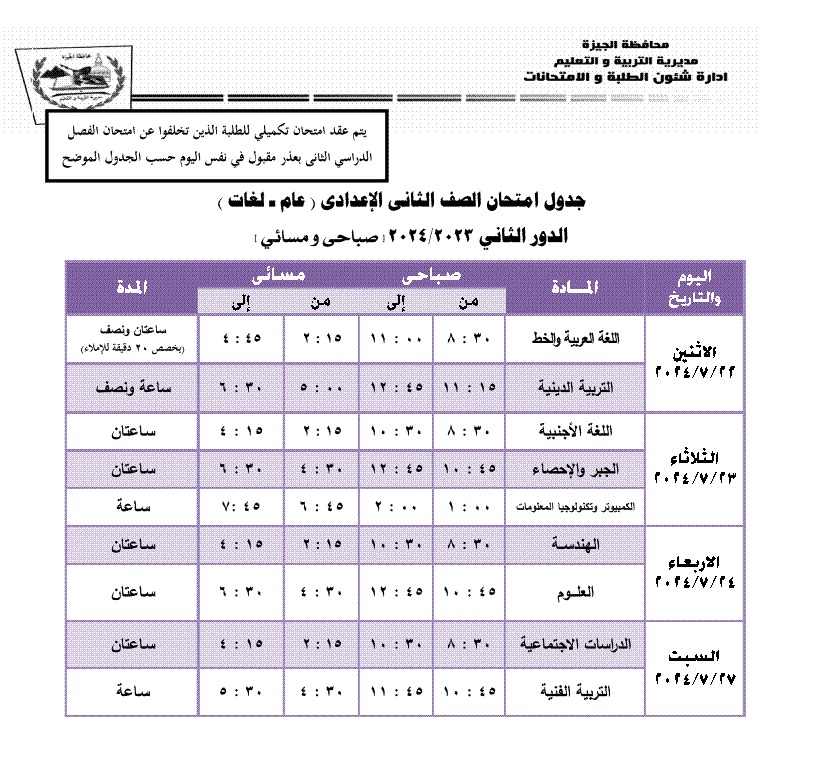 جداول امتحانات الترم الثاني 2024 محافظة الجيزة