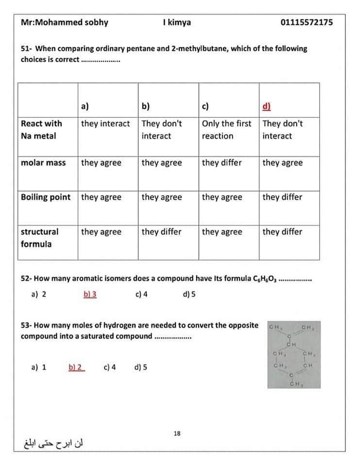 - عدد الأسئلة المقالية لمادة الكيمياء: 2.